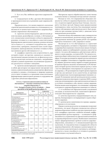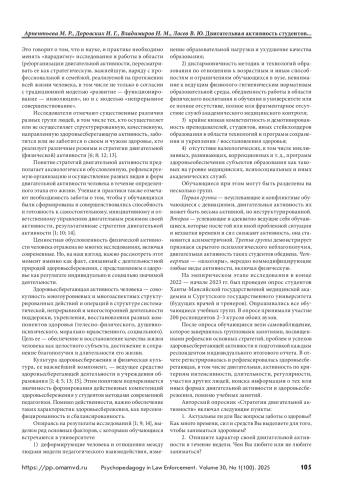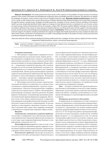 Представлены основные результаты исследования проблематики двигательной активности студентов вузов в контексте формирования и развития физической культуры и здоровьесбережения в целом. Цель — анализ стратегий двигательной активности сообучающихся в контексте задач здоровьесбережения. Материалы, результаты и обсуждение. Двигательный режим рассматривается как совокупность двигательной активности данного человека в течение фиксированного периода времени, например этапа жизни. Изучены различные стратегии двигательной активности студентов, различающихся по характеру ценностного отношения к здоровьесбережению и ведущим задачам поддержки их в образовательном процессе и процессе психолого-педагогического сопровождения. Выводы. Отмечается важность системной работы и сопровождения студентов, включая мотивацию и поддержку самостоятельного здоровьесбережения средствами физической культуры и иной двигательной активности, обогащение компетенций как системы знаний и умений в сфере двигательной активности вплоть до уровня профессиональной физической подготовки всех обучающихся.