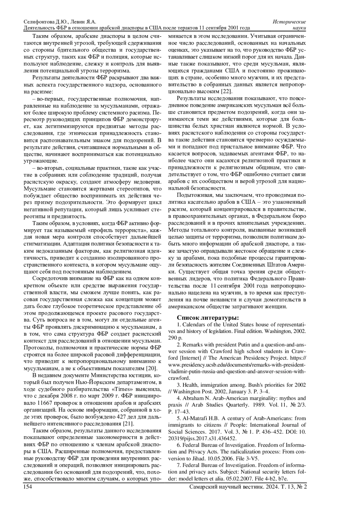 Террористический акт, произошедший в Нью-Йорке 11 сентября 2001 года и приведший к тысячам смертей в начале XXI столетия, изменил дипломатические отношения между странами всего мира, а также изменил взаимоотношения к арабскому народу в США. Соединенным Штатам Америки было необходимо принимать меры, чтобы контролировать арабское население как в Америке, так и по всему миру. Членами Палаты представителей США были представлены меры противодействия террористам, такие как запрет продажи оружия в страны, укрывающие террористов, поимка и наказание преступников и налаживание дружественных отношений с Россией и Китаем. В статье проанализированные данные меры, а также деятельность ФБР в отношении арабской диаспоры в США после терактов 11 сентября 2001 года. Отдельно автор рассмотрел взаимодействие Соединенных Штатов Америки и России в вопросе сдерживания терроризма в мире. В статье автором были рассмотрены следующие материалы: архивы администрации Джорджа Буша, архивы ФБР, архивы Департамента полиции Нью-Йорка, а также оценка дипломатов, социологов, историков, антропологов Соединенных Штатов Америки, являвшихся очевидцами и невольными наблюдателями происходящих в мире процессов.