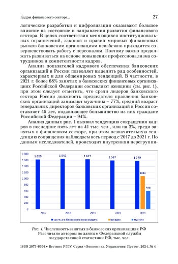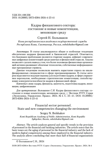 В статье анализируются общие и особенные тенденции обеспечения кадрами финансовой и банковской отраслей. Отмечается, что базовыми проблемами являются старение кадров, дефицит современных цифровых компетенций среди занятых в финансовой отрасли. Анализ позволяет сделать вывод о том, что более половины финансовых организаций активно развивают облачные технологии, собственные информационные программные сервисы. Данные тенденции позволили выявить нарастание спроса на квалифицированных специалистов в сфере программирования. В статье автором выделяются ведущие вызовы для подготовки кадров, в сфере управления персоналом, необходимые стратегические компетенции, способствующие конкурентоспособности кадров в финансовой сфере.