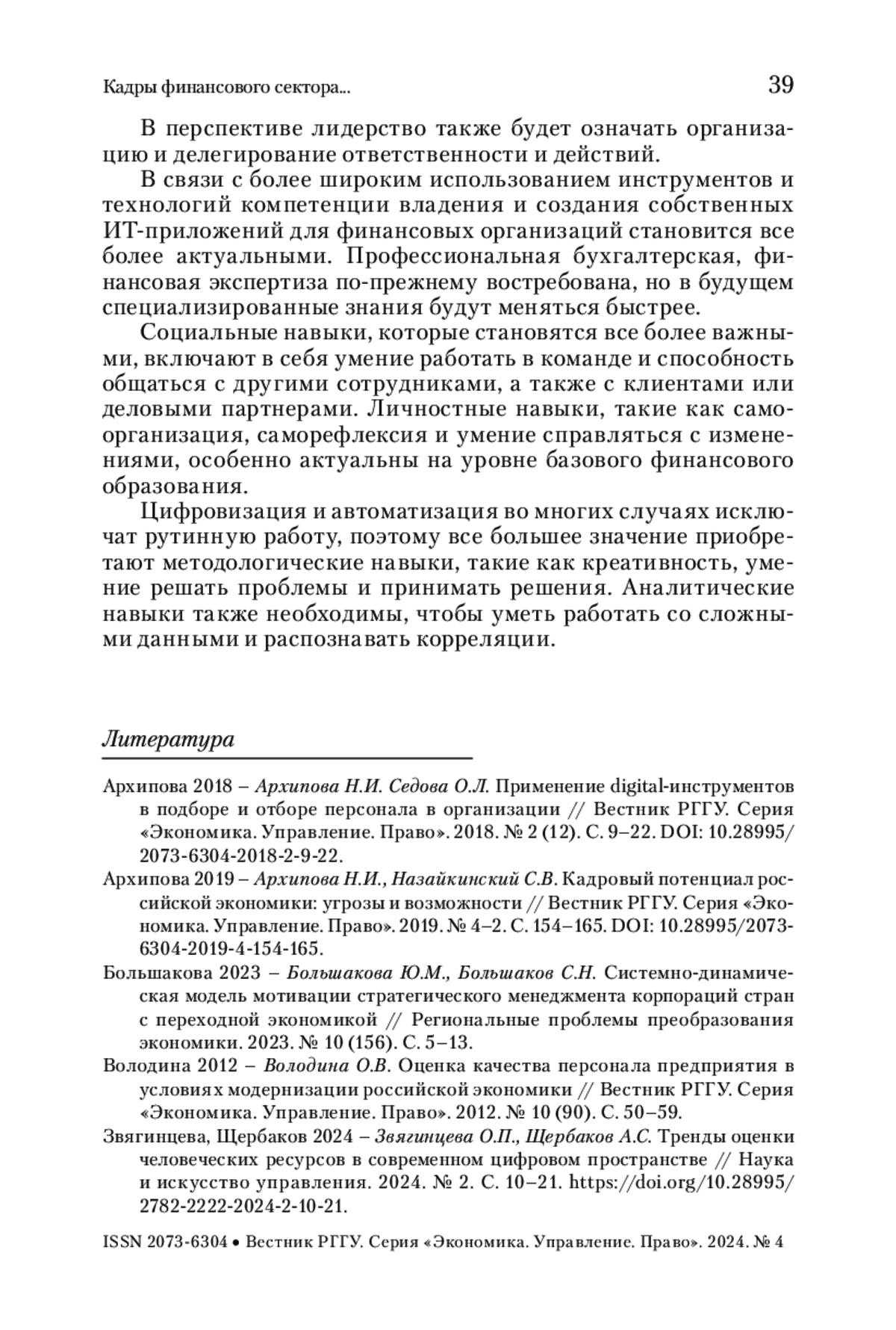 2. Архипова 2019 - Архипова Н.И., Назайкинский С.В. Кадровый потенциал российской экономики: угрозы и возможности // Вестник РГГУ. Серия «Экономика. Управление. Право». 2019. № 4-2. С. 154-165. https://doi.org/10.28995/2073-6304-2019-4-154-165.