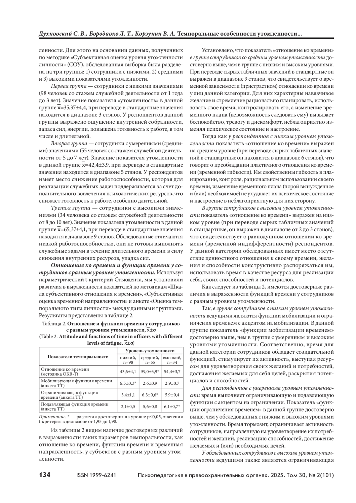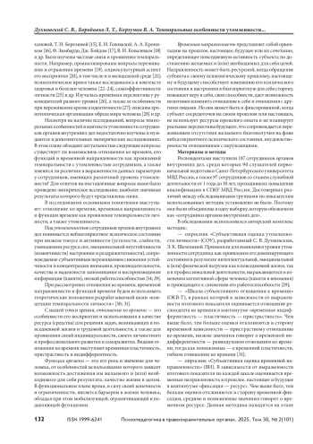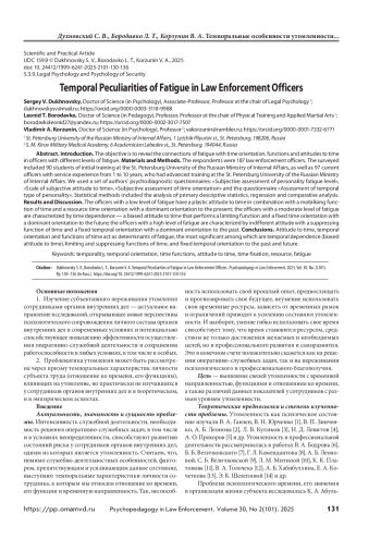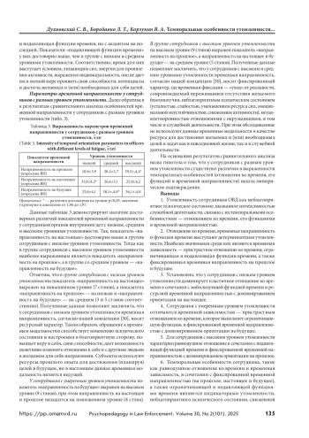 Служебно-деятельностные особенности: интенсивность, напряженность деятельности, необходимость решения оперативно-служебных задач в условиях неопределенности — являются условиями, способствующими развитию утомленности сотрудников органов внутренних дел. Другим немаловажным фактором, препятствующим и усиливающим данное состояние, выступают темпоральные характеристики личности сотрудника, к которым относятся отношение ко времени, его функции и временная направленность. Цель — выявление связей утомленности с временной направленностью, функциями и отношением ко времени у сотрудников с разным уровнем утомленности. Материалы и методы. Респондентами выступили 187 сотрудников органов внутренних дел (90 слушателей первоначальной подготовки Санкт-Петербургского университета МВД России, а также 97 сотрудников со стажем служебной деятельности от 1 года до 10 лет, проходивших повышение квалификации в СПбУ МВД России). Использовался комплекс авторских психодиагностических опросников: «Субъективная оценка уровня утомленности личности», «Шкала субъективного отношения к времени», «Субъективная оценка временной направленности» и анкета «Оценка темпорального типа личности». Статистическими методами выступили анализ первичных описательных статистик, регрессионный и сравнительный анализ. Результаты и обсуждение. У сотрудников с низким уровнем утомленности превалирует пластичное отношение ко времени в сочетании с мобилизующей функцией времени и ресурсной временной направленностью с доминированием ориентации на настоящее. Сотрудники с умеренным уровнем утомленности отличаются временной зависимостью — пристрастным отношением ко времени, которое выполняет ограничивающую функцию, и фиксированной временной направленностью с доминированием ориентации на будущее. Для сотрудников с высоким уровнем утомленности характерно равнодушное отношение в сочетании с подавляющей функцией времени и фиксированной временной направленностью с доминированием ориентации на прошлое. Выводы. Отношение ко времени, временная направленность и функции времени выступают детерминантами утомленности, наиболее значимыми среди которых являются временная зависимость (пристрастное отношение ко времени), ограничивающая и подавляющая функции времени, а также фиксированная временная направленность на прошлое и будущее.