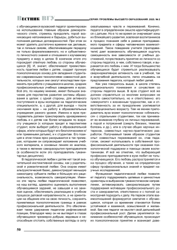 Требуется учитывать и обращать внимание студентов, приобретающих в вузе профессию педагога, на то, что в школе центром деятельности учителя является еще не сформированная до конца личность ребенка. А значит, учительская любовь подразумевает в большей степени бережное отношение, создание зоны большего комфорта, в которой постепенно склад и отдельные черты становящейся личности должны укрепиться. В вузе же преподаватель имеет дело с уже более зрелой личностью. Это проявляется, в частности, в выборе ею высшего учебного заведения и направления подготовки. Следовательно, студенту меньше и реже требуется эмоционально фокусированное внимание и персонализированный интерес.