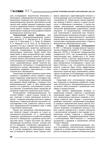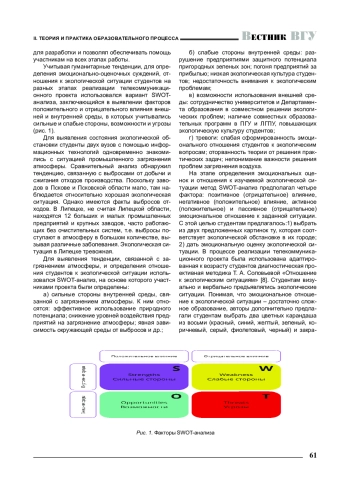В статье раскрываются возможности использования телекоммуникационных проектов в высшей школе; описываются их особенности, способствующие развитию критического мышления, эмоционального отношения к действительности. Дается описание создания телекоммуникационного проекта в сотрудничестве университетов Пскова и Липецка; с помощью SWOT-анализа определяются основные позиции экологической ситуации в этих городах и факторы загрязнения атмосферы. Доказывается эффективность использования телекоммуникационного проекта в формировании экологического отношения у студентов.