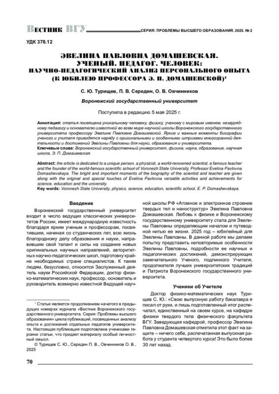 Статья посвящена уникальному человеку, физику, ученому с мировым именем, незаурядному педагогу и основателю известной во всем мире научной школы Воронежского государственного университета профессору Эвелине Павловне Домашевской. Яркие и важные моменты биографии ученого и учителя приводятся наряду с оригинальными и особенными штрихами многогранной деятельности и достижений Эвелины Павловны для науки, образования и университета.