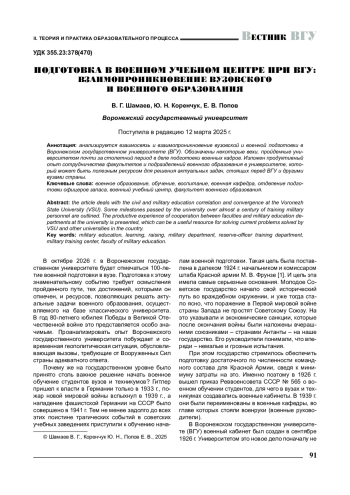 Анализируется взаимосвязь и взаимопроникновение вузовской и военной подготовки в Воронежском государственном университете (ВГУ). Обозначены некоторые вехи, пройденные университетом почти за столетний период в деле подготовки военных кадров. Изложен продуктивный опыт сотрудничества факультетов и подразделений военного образования в университете, который может быть полезным ресурсом для решения актуальных задач, стоящих перед ВГУ и другими вузами страны.