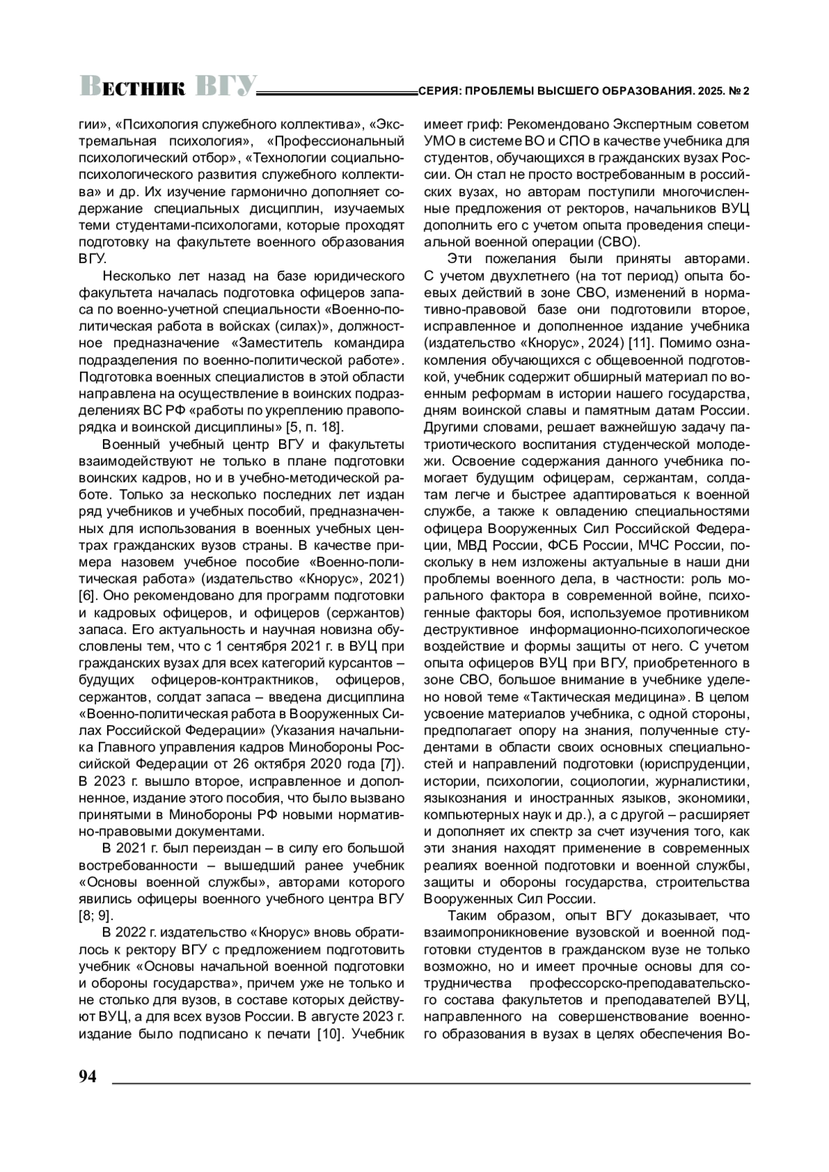 Сегодня ВГУ является единственным гражданским вузом России, где ведется подготовка кадровых офицеров в интересах Департамента информации и массовых коммуникаций Министерства обороны РФ по специальности «Военная журналистика». В ее реализации на равных правах участвуют факультет журналистики и ВУЦ, опираясь на ранее накопленный опыт сотрудничества. И это уже не просто взаимодействие военной и вузовской подготовки, а единое целое. На факультете философии и психологии на базе специальности «Психология служебной деятельности» в ВУЦ готовят офицеров по учетновоенной специальности «Военная психология» в интересах Департамента психологической работы Министерства обороны РФ.