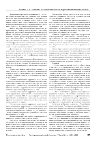 В современном мире среди специалистов разных областей существует необходимость формирования внутренней потребности в самоактуализации и реализации собственного творческого потенциала в личностном росте. Цель — актуализировать проблему взаимосвязи между степенью выраженности самоактуализации и типом направленности личности студентов педагогического вуза. Результаты и обсуждение. Важнейшими факторами, определяющими эффективность работы, являются психическое здоровье, высокая личностная зрелость, стремление к самоактуализации, проявляющееся в желании познать окружающий мир, способности брать на себя ответственность, рефлексии, самопринятии и самоуважении, а также готовности к дальнейшему развитию и самосовершенствованию себя. Выводы. Выявлено, что значимой взаимосвязи между самоактуализацией и типами направленности личности нет. Существует лишь взаимосвязь между отдельными показателями самоактуализации и типами направленности личности в группах с высокой и низкой степенями выраженности самоактуализации.