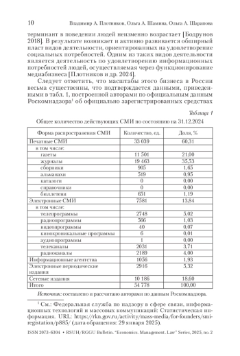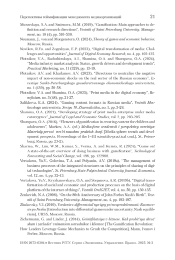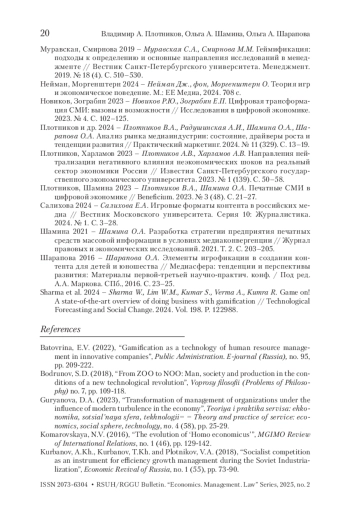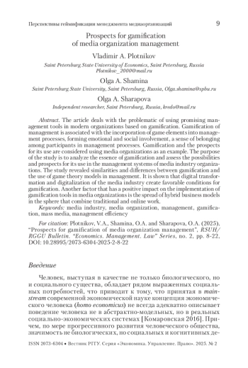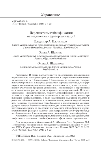 ПЛОТНИКОВ В. А., ШАМИНА О. А., ШАРАПОВА О. А. ПЕРСПЕКТИВЫ ГЕЙМИФИКАЦИИ МЕНЕДЖМЕНТА МЕДИАОРГАНИЗАЦИЙ // ВЕСТНИК РГГУ. СЕРИЯ: ЭКОНОМИКА. УПРАВЛЕНИЕ. ПРАВО. 2025. № 2