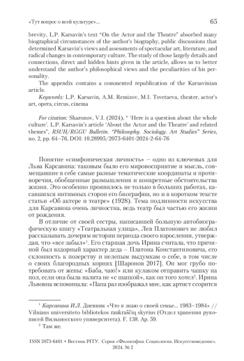 Статья посвящена малоизвестному тексту Л. П. Карсавина, опубликованному в журнале «Балтийский альманах» в мае 1928 г. Несмотря на кажущуюся краткость, текст Л. П. Карсавина «Об актере и театре» вобрал в себя многие биографические обстоятельства биографии автора, общественные дискуссии, которые определили взгляды и оценки Карсавина на зрелищное искусство, литературу и радикальные изменения в современной культуре. Изучение этих во многом деталей и связей, прямых и скрытых намеков, содержащихся в статье, позволяет нам лучше понять философские взгляды автора и особенности его личности.