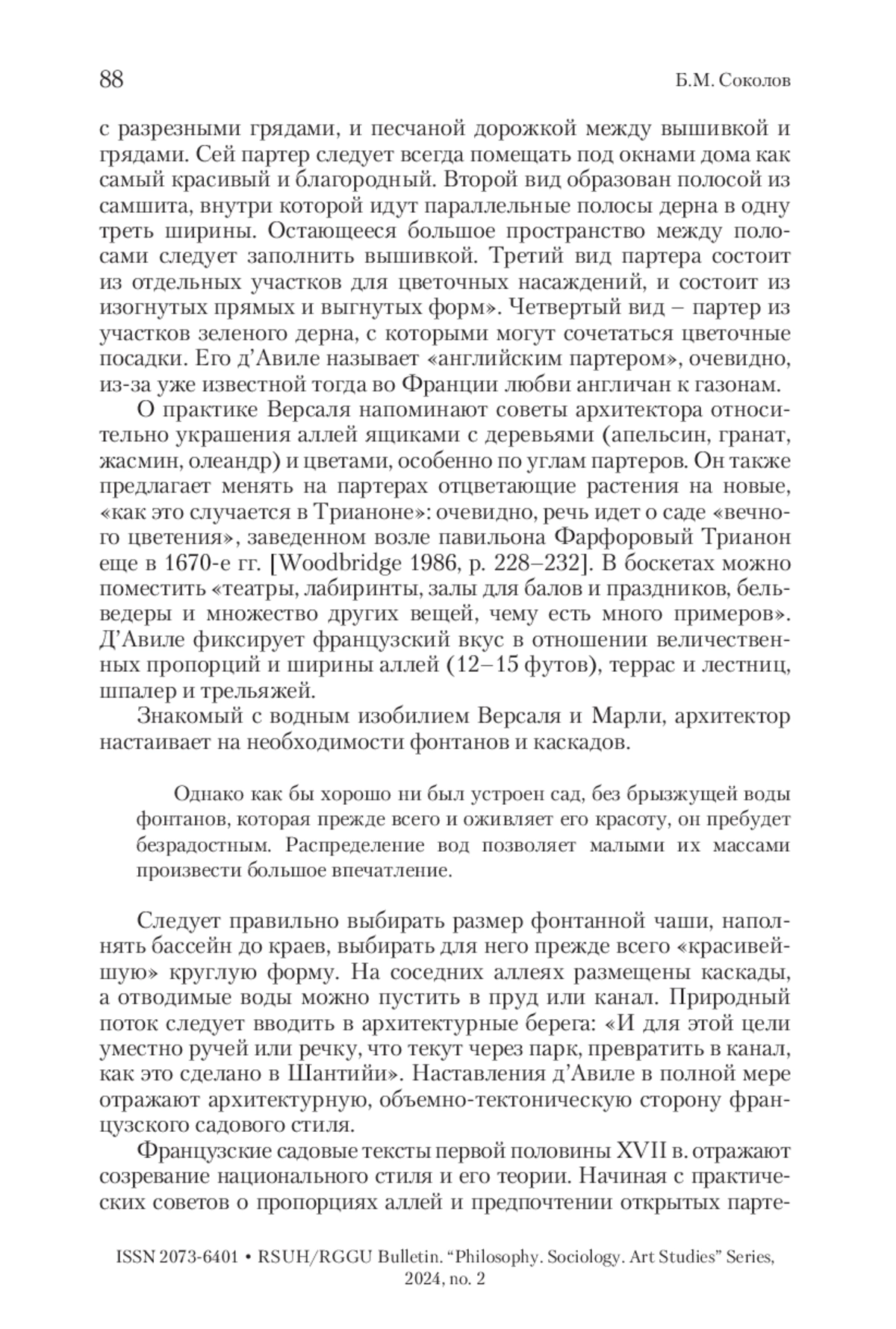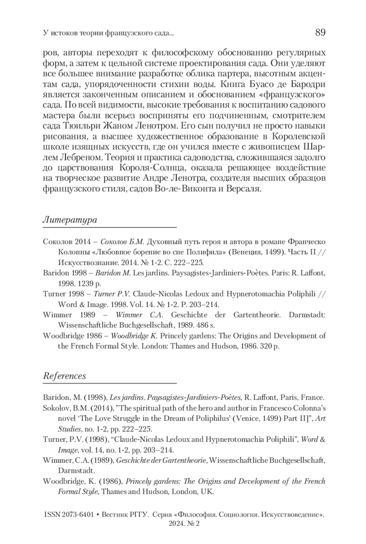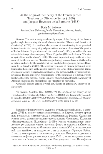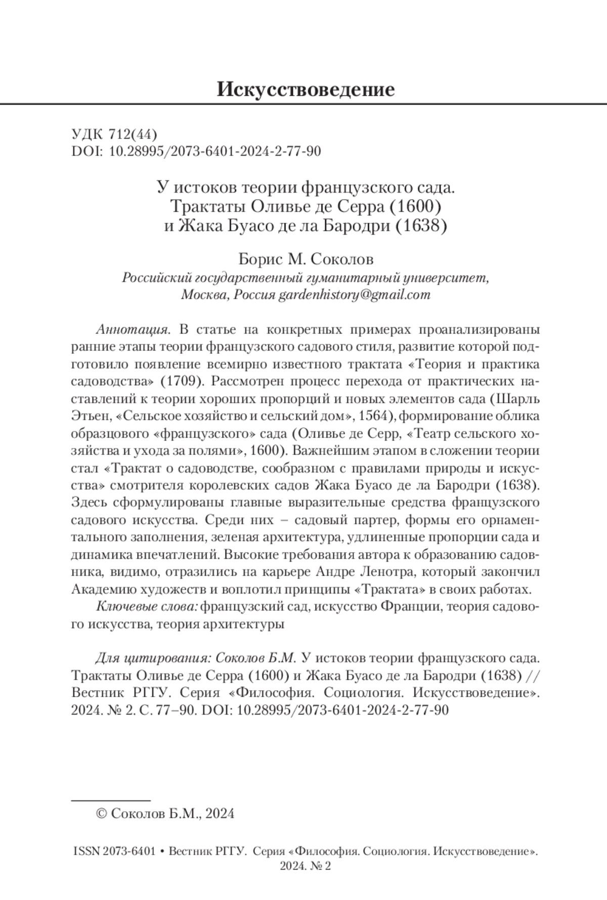 СОКОЛОВ Б. М. У ИСТОКОВ ТЕОРИИ ФРАНЦУЗСКОГО САДА. ТРАКТАТЫ ОЛИВЬЕ ДЕ СЕРРА (1600) И ЖАКА БУАСО ДЕ ЛА БАРОДРИ (1638) // ВЕСТНИК РГГУ. СЕРИЯ: ФИЛОСОФИЯ. СОЦИОЛОГИЯ. ИСКУССТВОВЕДЕНИЕ. 2024. № 2