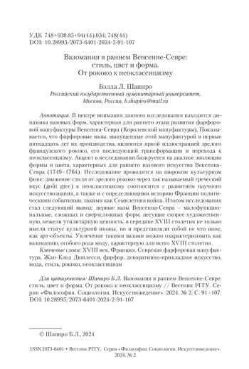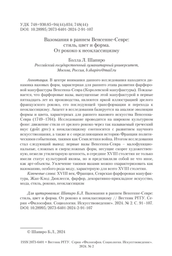 В центре внимания данного исследования находится динамика вазовых форм, характерная для раннего этапа развития фарфоровой мануфактуры Венсенна-Севра (Королевской мануфактуры). Показывается, что фарфоровые вазы, выпущенные этой мануфактурой в первые пятнадцать лет их производства, являются яркой иллюстрацией зрелого французского рококо, его последующей трансформации и перехода к неоклассицизму. Акцент в исследовании базируется на анализе эволюции формы и цвета, характерных для раннего вазового искусства ВенсеннаСевра (1749–1764). Исследование проводится на широком культурном фоне: движение стиля от зрелого рококо через так называемый греческий вкус (goûtgrec) к неоклассицизму соотносится с развитием научного искусствознания, а также и с определяющими историю Франции политическими событиями, такими как Семилетняя война. Итогом исследования стал следующий вывод: первые вазы Венсенна-Севра – малофункциональные, сложных и сверхсложных форм, несущие скорее художественную, нежели утилитарную ценность, в середине XVIII столетия не только имели статус культурной иконы, но и представляли собой не что иное, как арт-объекты. Увлечение такими вазами можно охарактеризовать как вазоманию, особого рода моду, характерную для всего XVIII столетия.