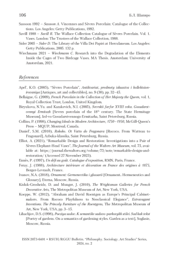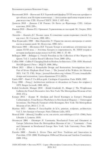 11. Elliott 2021 - Elliott A. Remarkable Design and Restoration: Investigations into a Pair of Sèvres Elephant-Head Vases // The Journal of the Walters Art Museum. 2021. Vol. 75. URL: https://journal.thewalters.org/volume/75/note/remarkabledesign-and-restoration (дата обращения 27.11.2023).