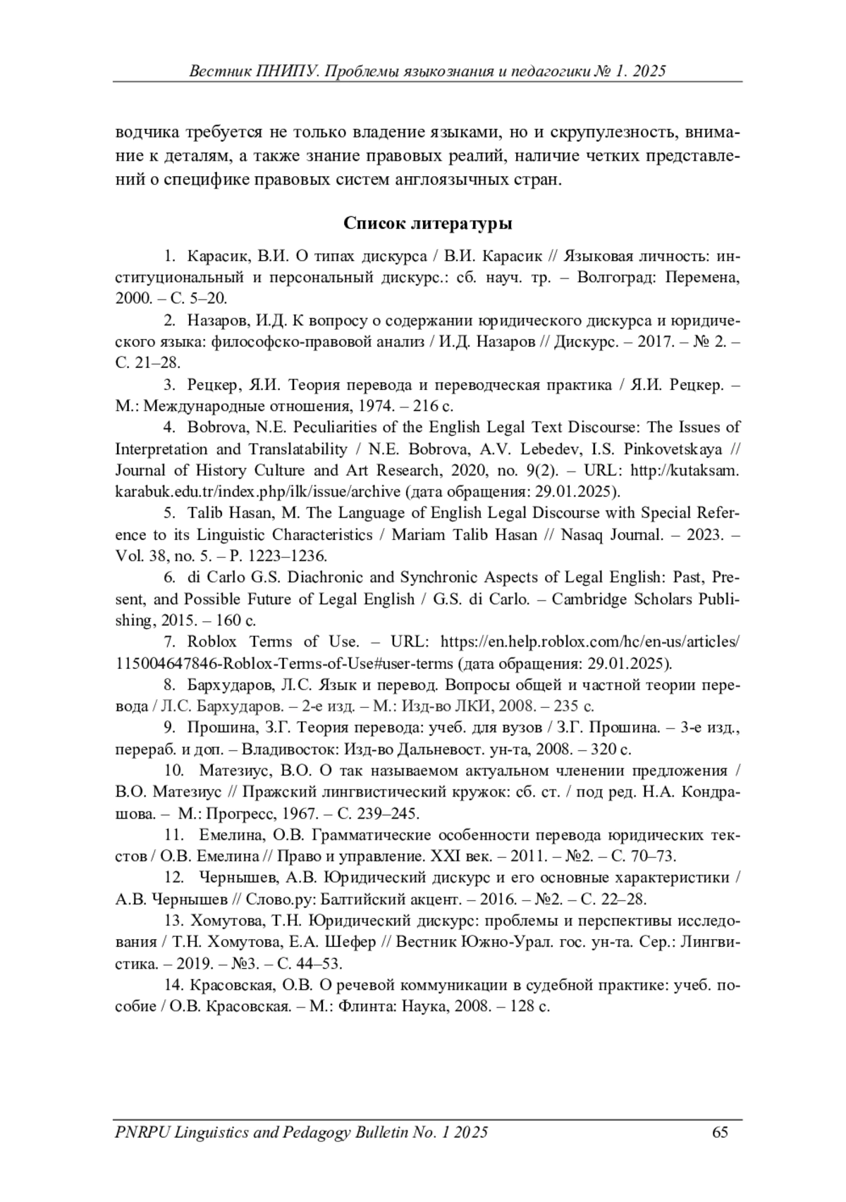 4. Bobrova, N.E. Peculiarities of the English Legal Text Discourse: The Issues of Interpretation and Translatability / N.E. Bobrova, A.V. Lebedev, I.S. Pinkovetskaya //Journal of History Culture and Art Research. 2020. Т. 9. - № 2. - С. 318. - URL: http://kutaksam.karabuk.edu.tr/index.php/ilk/issue/archive (дата обращения: 29.01.2025). EDN: JYHBZK