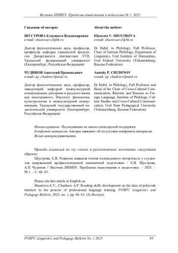 ШУСТРОВА Е. В., ЧУДИНОВ А. П. РАЗВИТИЕ НАВЫКОВ ЧТЕНИЯ ПОЛИКОДОВОГО ИНТЕРТЕКСТА У СТУДЕНТОВ НАПРАВЛЕНИЙ ПРОФЕССИОНАЛЬНОЙ ИНОЯЗЫЧНОЙ ПОДГОТОВКИ // ВЕСТНИК ПЕРМСКОГО НАЦИОНАЛЬНОГО ИССЛЕДОВАТЕЛЬСКОГО ПОЛИТЕХНИЧЕСКОГО УНИВЕРСИТЕТА. ПРОБЛЕМЫ ЯЗЫКОЗНАНИЯ И ПЕДАГОГИКИ. 2025. № 1