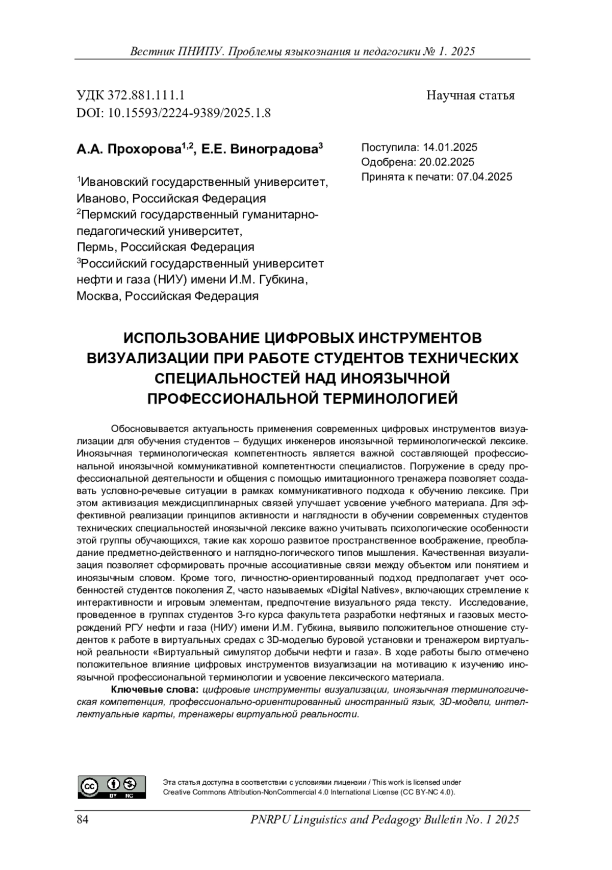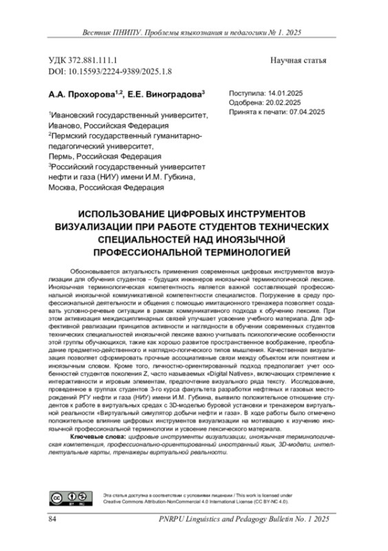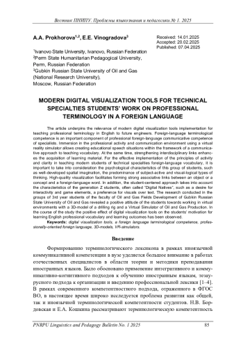 Обосновывается актуальность применения современных цифровых инструментов визуализации для обучения студентов – будущих инженеров иноязычной терминологической лексике. Иноязычная терминологическая компетентность является важной составляющей профессиональной иноязычной коммуникативной компетентности специалистов. Погружение в среду профессиональной деятельности и общения с помощью имитационного тренажера позволяет создавать условно-речевые ситуации в рамках коммуникативного подхода к обучению лексике. При этом активизация междисциплинарных связей улучшает усвоение учебного материала. Для эффективной реализации принципов активности и наглядности в обучении современных студентов технических специальностей иноязычной лексике важно учитывать психологические особенности этой группы обучающихся, такие как хорошо развитое пространственное воображение, преобладание предметно-действенного и наглядно-логического типов мышления. Качественная визуализация позволяет сформировать прочные ассоциативные связи между объектом или понятием и иноязычным словом. Кроме того, личностно-ориентированный подход предполагает учет особенностей студентов поколения Z, часто называемых «Digital Natives», включающих стремление к интерактивности и игровым элементам, предпочтение визуального ряда тексту. Исследование, проведенное в группах студентов 3-го курса факультета разработки нефтяных и газовых месторождений РГУ нефти и газа (НИУ) имени И. М. Губкина, выявило положительное отношение студентов к работе в виртуальных средах с 3D-моделью буровой установки и тренажером виртуальной реальности «Виртуальный симулятор добычи нефти и газа». В ходе работы было отмечено положительное влияние цифровых инструментов визуализации на мотивацию к изучению иноязычной профессиональной терминологии и усвоение лексического материала