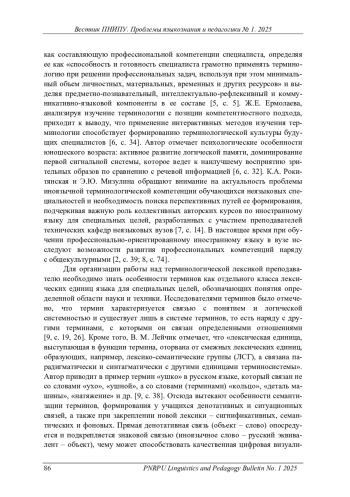 Формированию терминологического лексикона в рамках иноязычной коммуникативной компетенции в вузе уделяется большое внимание в работах отечественных специалистов в области теории и методики преподавания иностранных языков. Было обосновано применение интегративного и коммуникативно-когнитивного подходов к обучению иностранным языкам, тезаурусного подхода к организации и введению профессиональной лексики [1–4]. В рамках современного компетентностного подхода, отраженного в ФГОС ВО, в настоящее время широко исследуется проблема развития как общей, так и иноязычной терминологической компетентности студентов.
