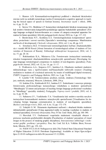 7. Рокитянская, К.А. Формирование иноязычной терминологической компетенции обучающихся неязыковых специальностей / К.А. Рокитянская, Э.Ю. Мизюрова // Педагогический журнал. - 2022. -Т. 12, № 1А. - С. 11-17. EDN: ZOUBLB