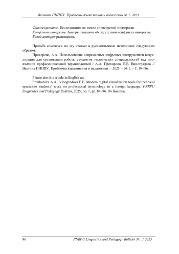 11. Султанова, И.В. Визуализация как средство развития навыков иноязычной коммуникации студентов неязыковых специальностей / И.В. Султанова, Т.А. Васильченко // Бизнес и дизайн ревю. - 2023. - № 4 (32). - С. 172-178. EDN: EDGAEQ