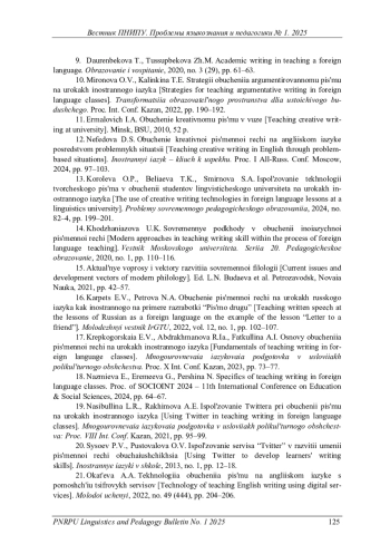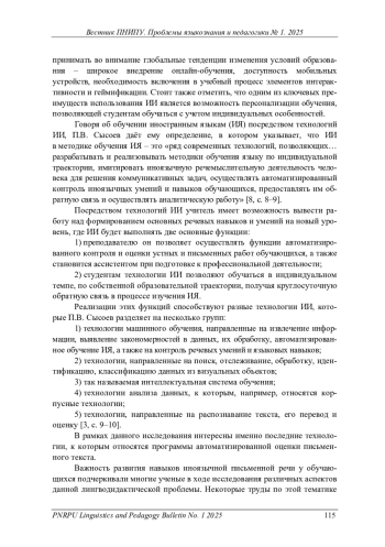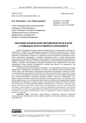 КАТАЛКИНА Н. А., СИБГАТУЛЛИНА А. А. ОБУЧЕНИЕ ИНОЯЗЫЧНОЙ ПИСЬМЕННОЙ РЕЧИ В ВУЗЕ С ПОМОЩЬЮ ИСКУССТВЕННОГО ИНТЕЛЛЕКТА // ВЕСТНИК ПЕРМСКОГО НАЦИОНАЛЬНОГО ИССЛЕДОВАТЕЛЬСКОГО ПОЛИТЕХНИЧЕСКОГО УНИВЕРСИТЕТА. ПРОБЛЕМЫ ЯЗЫКОЗНАНИЯ И ПЕДАГОГИКИ. 2025. № 1