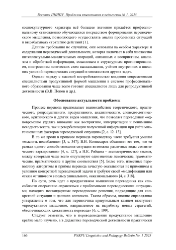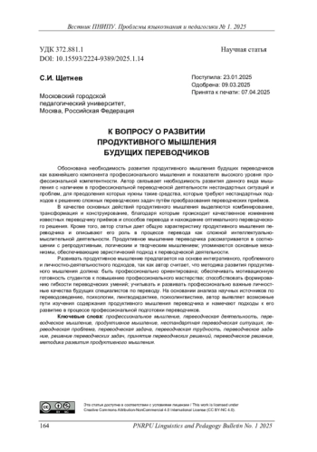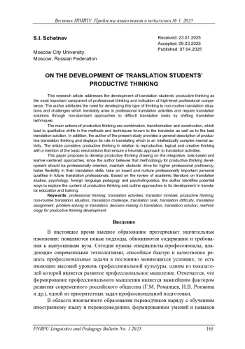 Обоснована необходимость развития продуктивного мышления будущих переводчиков как важнейшего компонента профессионального мышления и показателя высокого уровня профессиональной компетентности. Автор связывает необходимость развития данного вида мышления с наличием в профессиональной переводческой деятельности нестандартных ситуаций и проблем, для преодоления которых нужны такие средства, которые требуют нестандартных подходов к решению сложных переводческих задач путём преобразования переводческих приёмов.