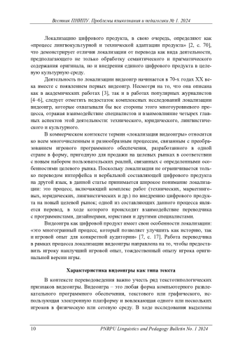 В контексте переводоведения все более актуальными становятся исследования текстов, интегрированных в тот или иной цифровой продукт. Особого внимания заслуживает процесс локализации, так как данный вид деятельности широко представлен на рынке переводческих услуг и требует разработки особых подходов и принципов. Целью данного исследования является выявление особенностей передачи интертекстуальных включений при локализации текста видеоигры на примере национально-прецедентных феноменов