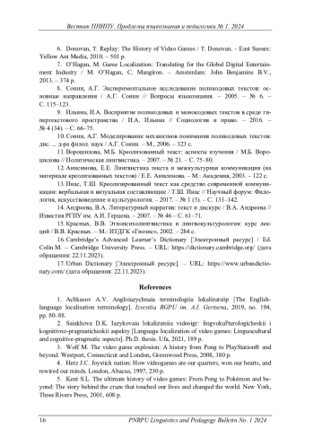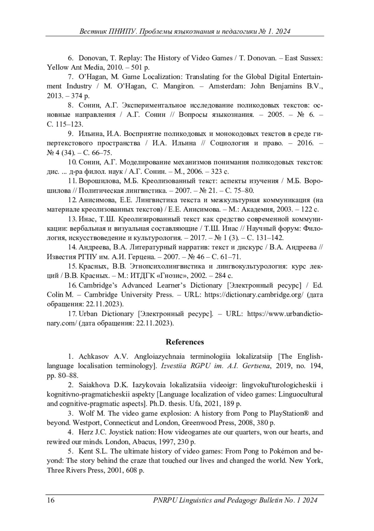 2. Саяхова, Д.К. Языковая локализация видеоигр: лингвокультурологический и когнитивно-прагматический аспекты: дис. … канд. филол. наук / Д.К. Саяхова. - Уфа, 2021. - 189 с. EDN: KVTWJA
