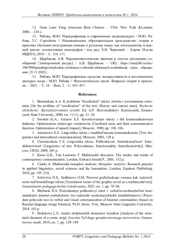 13. Рябова, М.Ю. Параграфемика в современном медиадискурсе / М.Ю. Рябова, Т.С. Сергейчик // Инновационное образовательное пространство: теория и практика обучения иностранным языкам и русскому языку как иностранному в высшей школе: коллективная монография / под ред. Е.И. Чирковой. - Киров: Изд-во МЦИТО, 2018. - С. 154-171. EDN: IQYSQU