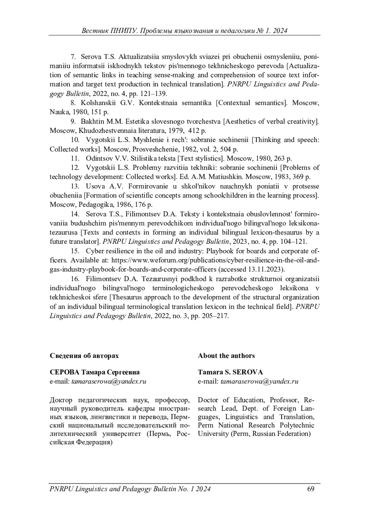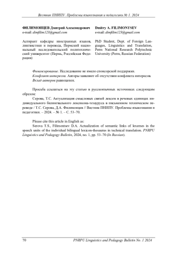 СЕРОВА Т. С., ФИЛИМОНЦЕВ Д. А. АКТУАЛИЗАЦИЯ СМЫСЛОВЫХ СВЯЗЕЙ ЛЕКСЕМ В РЕЧЕВЫХ ЕДИНИЦАХ ИНДИВИДУАЛЬНОГО БИЛИНГВАЛЬНОГО ЛЕКСИКОНА-ТЕЗАУРУСА В ПИСЬМЕННОМ ТЕХНИЧЕСКОМ ПЕРЕВОДЕ // ВЕСТНИК ПЕРМСКОГО НАЦИОНАЛЬНОГО ИССЛЕДОВАТЕЛЬСКОГО ПОЛИТЕХНИЧЕСКОГО УНИВЕРСИТЕТА. ПРОБЛЕМЫ ЯЗЫКОЗНАНИЯ И ПЕДАГОГИКИ. 2024. № 1