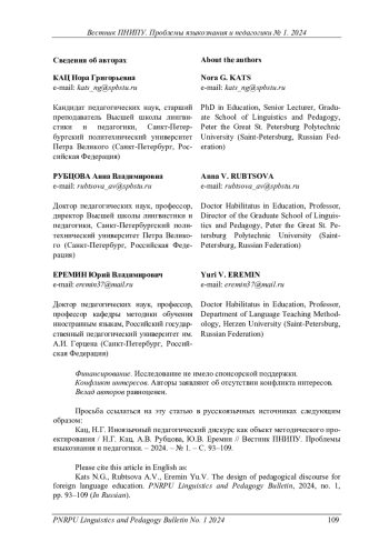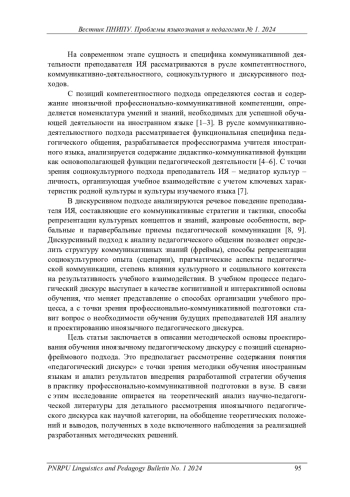 Анализируется понятие педагогического дискурса в русле современных лингвистических и педагогических научных работ, исследуется его методический потенциал. Актуальность темы обусловлена необходимостью внедрения профессионально-коммуникативного компонента в содержание практической подготовки преподавателей иностранного языка в вузе и, следовательно, разработки методической основы обучения иноязычному педагогическому дискурсу. В статье рассматриваются лингвистические, педагогические и лингводидактические подходы к определению понятия «педагогический дискурс», выявляются его ключевые характеристики. Анализируется методическая основа проектирования обучения иноязычному педагогическому дискурсу с позиций сценарно-фреймового подхода: обосновывается содержание обучения иноязычному педагогическому дискурсу; предлагается методическая стратегия организации учебного взаимодействия; проектируется структура учебного блока; формулируются принципы разработки учебных материалов. Апробация разработанных учебных материалов проходила в СПбПУ при участии студентов магистратуры, обучающихся по направлениям подготовки 44.04.01 «Педагогическое образование» и 45.04.02 «Лингвистика» со специализацией в методике обучения иностранным языкам. Полученные результаты позволяют оценить результативность предлагаемых методических решений и обобщить накопленный практический опыт. Представленные в статье теоретические и практические обобщения могут быть востребованными в организации профессионально-коммуникативной подготовки будущих преподавателей иностранного языка в вузе