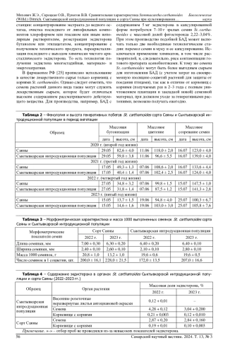 Проведена сравнительная оценка биологических и биохимических показателей растений Stemmacantha carthamoides местной репродукции и сорта Саяны, культивируемых в условиях подзоны средней тайги Республики Коми. Показано, что в условиях культуры особи обоих образцов характеризуются высокими показателями жизненности особей, семенной продуктивности, накапливают в надземных и подземных органах достаточное количество экдистерона (не менее 0,1%). Отмечено, что почвенно-климатические условия района интродукции благоприятны для выращивания обоих изучаемых образцов St. carthamoides, и Сыктывкарская популяция может служить основой для создания нового сорта. По содержанию экдистерона в корневищах с корнями и весенних розеточных листьях Сыктывкарская интродукционная популяция не уступает сорту Саяны и превосходит последний по количеству данного вещества в семенах. В неразвернувшихся листьях массовая доля экдистерона составила не менее 0,12 ± 0,01%. Установлено, что максимальное количество экдистероидов находится в зрелых семенах St. carthamoides и их содержание зависит от образца и погодных условий вегетационного сезона (Сыктывкарская популяция - 3,04-4,28%, сорт Саяны - 2,84-2,87%). Обращено внимание на возможность извлечения экдистерона технологически более выгодным путем, используя зрелые семена St. carthamoides. Отмечена проблема ежегодного получения доброкачественных семян данного вида - защита урожая семян от склевывания вьюрками.