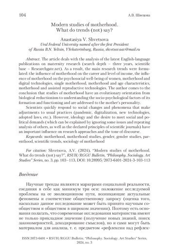 Статья посвящена анализу новейших англоязычных публикаций по исследованиям материнства (глубина поиска – три года, научная база – researchgate. net). В результате сформулированы основные исследовательские тренды: влияние материнства на карьеру и уровень доходов, влияние материнства на психосоциальное самочувствие женщины, материнство и цифровые технологии, одинокое материнство, материнство и возрастные особенности, материнство и вспомогательные репродуктивные технологии. Автор приходит к выводу, что исследования материнства имеют эволюционную направленность от биологического редукционизма к осмыслению социально-психологических факторов его становления и функционирования, обращены к субъектности матери. Ученые оперативно реагируют на общественные изменения и феномены, вносящие коррективы в привычные практики (пандемия, цифровизация, новые технологии, принимаемые законы и т. д.). Однако существенное влияние на формирование исследовательских полей и тональность дискурса имеет идеология и стремление соответствовать общественному и политическому запросу (что можно обнаружить в игнорировании одних проблем и избыточном анализе других, а также декларируемых принципах научных журналов). Ключевые слова
