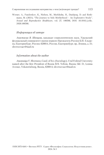15. Werner et al. 2021 - Werner A., Funderskov K., Nielsen M., Mоrkholm H., Danbjоrg D., Rothmann M. The Journey to Solo Motherhood - An Explorative Study // Sexual and Reproductive Healthcare. 2021. № 27. P. 100586. https://doi.org/10.1016/j.srhc.2020.100586.