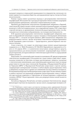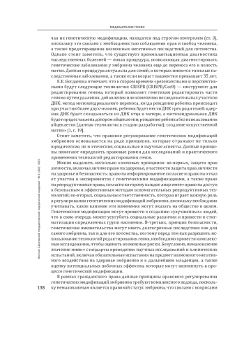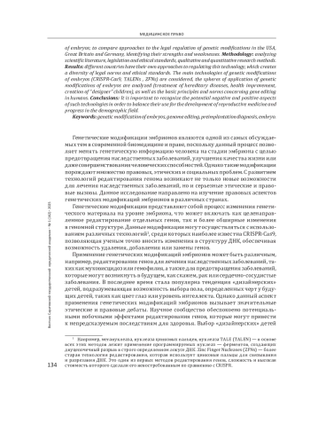 Введение: генетические модификации эмбрионов представляют собой одну из самых обсуждаемых тем, поскольку благодаря данной технологии возможно изменить генетическую информацию на этапе эмбрионального развития с целью предотвращения наследственных болезней, повышения качества жизни и даже улучшения определенных человеческих характеристик. Однако такие вмешательства вызывают множество правовых, этических и социальных дилемм. Цель - проанализировать существующие правовые нормы и подходы к генетическим модификациям эмбрионов в различных странах; определить основные этические и правовые дилеммы, возникающие в связи с генетическим редактированием эмбрионов; сравнить подходы к правовому регулированию генетических модификаций в США, Великобритании и Германии, выявив их сильные и слабые стороны. Методологическая основа: анализ научной литературы, законодательства и этических норм, качественные и количественные методы исследования. Результаты: разные страны имеют свои подходы к регулированию рассматриваемой технологии, что создает разнообразие правовых норм и этических стандартов. Рассмотрены основные технологии генетических модификаций эмбрионов (CRISPR-Cas9, TALENs, ZFNs), проанализированы сферы применения генетических модификаций эмбрионов (лечение наследственных заболеваний, улучшение здоровья, создание «дизайнерских» детей), а также основные принципы и нормы, касающиеся редактирования генов человека. Выводы: важно осознавать потенциальные негативные и положительные стороны применения таких технологий, чтобы сбалансировать их использование для развития репродуктивной медицины, прогресса в демографической области.