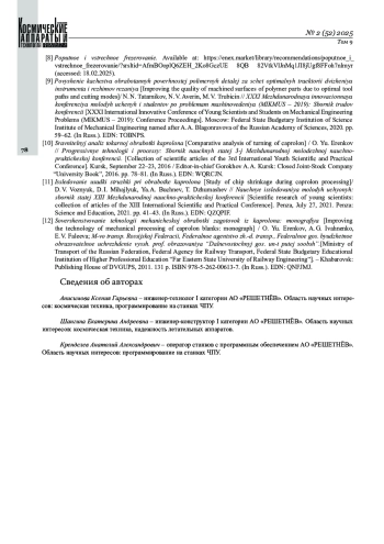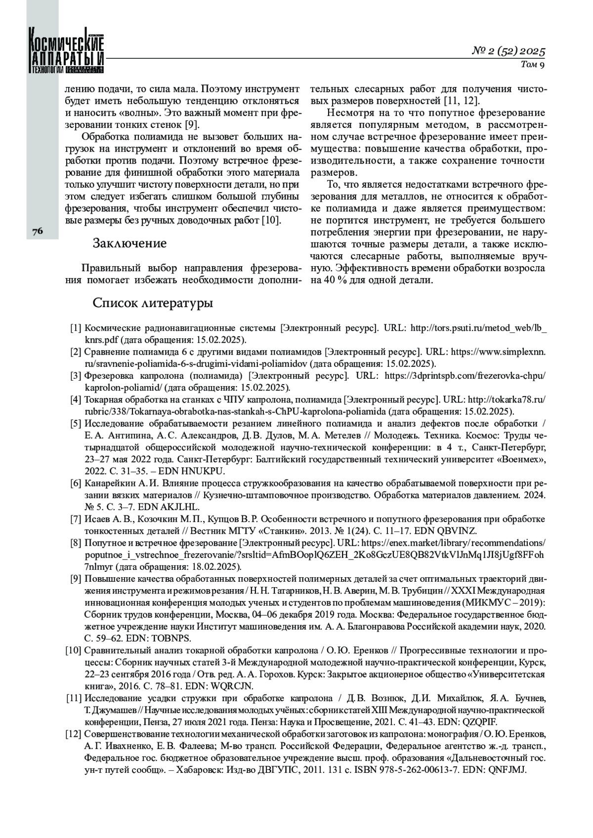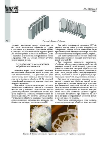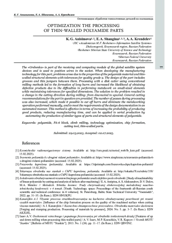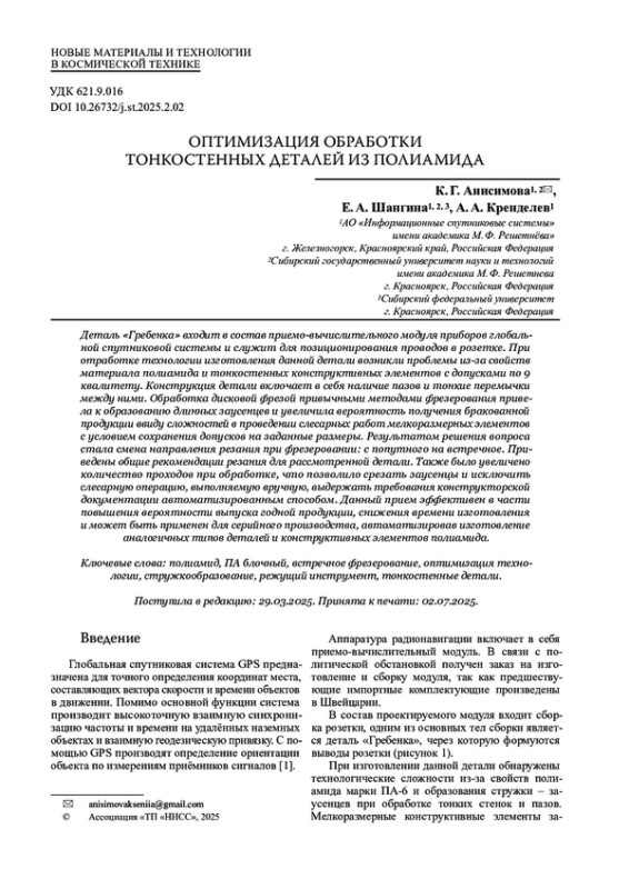 АНИСИМОВА К. Г., ШАНГИНА Е. А., КРЕНДЕЛЕВ А. А. ОПТИМИЗАЦИЯ ОБРАБОТКИ ТОНКОСТЕННЫХ ДЕТАЛЕЙ ИЗ ПОЛИАМИДА // КОСМИЧЕСКИЕ АППАРАТЫ И ТЕХНОЛОГИИ. 2025. № 2 (52), ТОМ 9