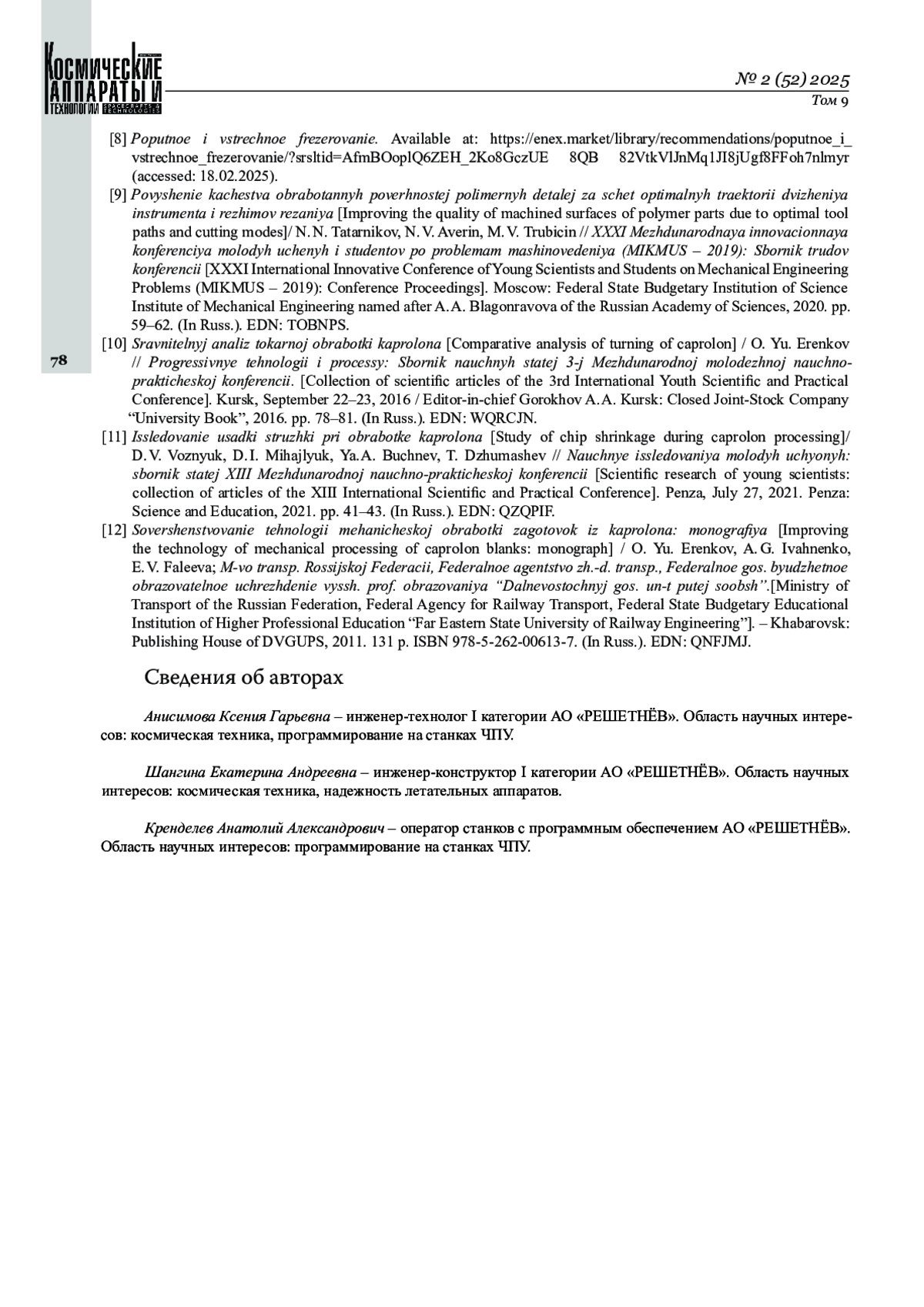 Журнал: КОСМИЧЕСКИЕ АППАРАТЫ И ТЕХНОЛОГИИ