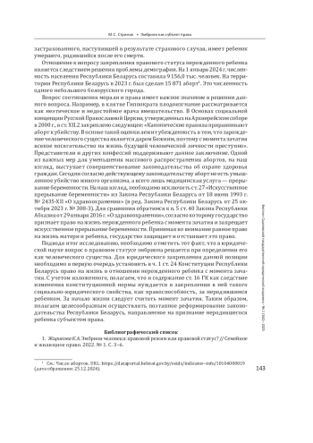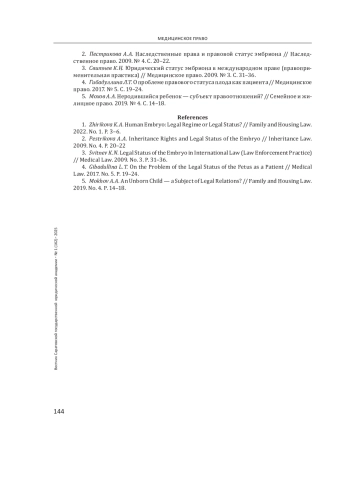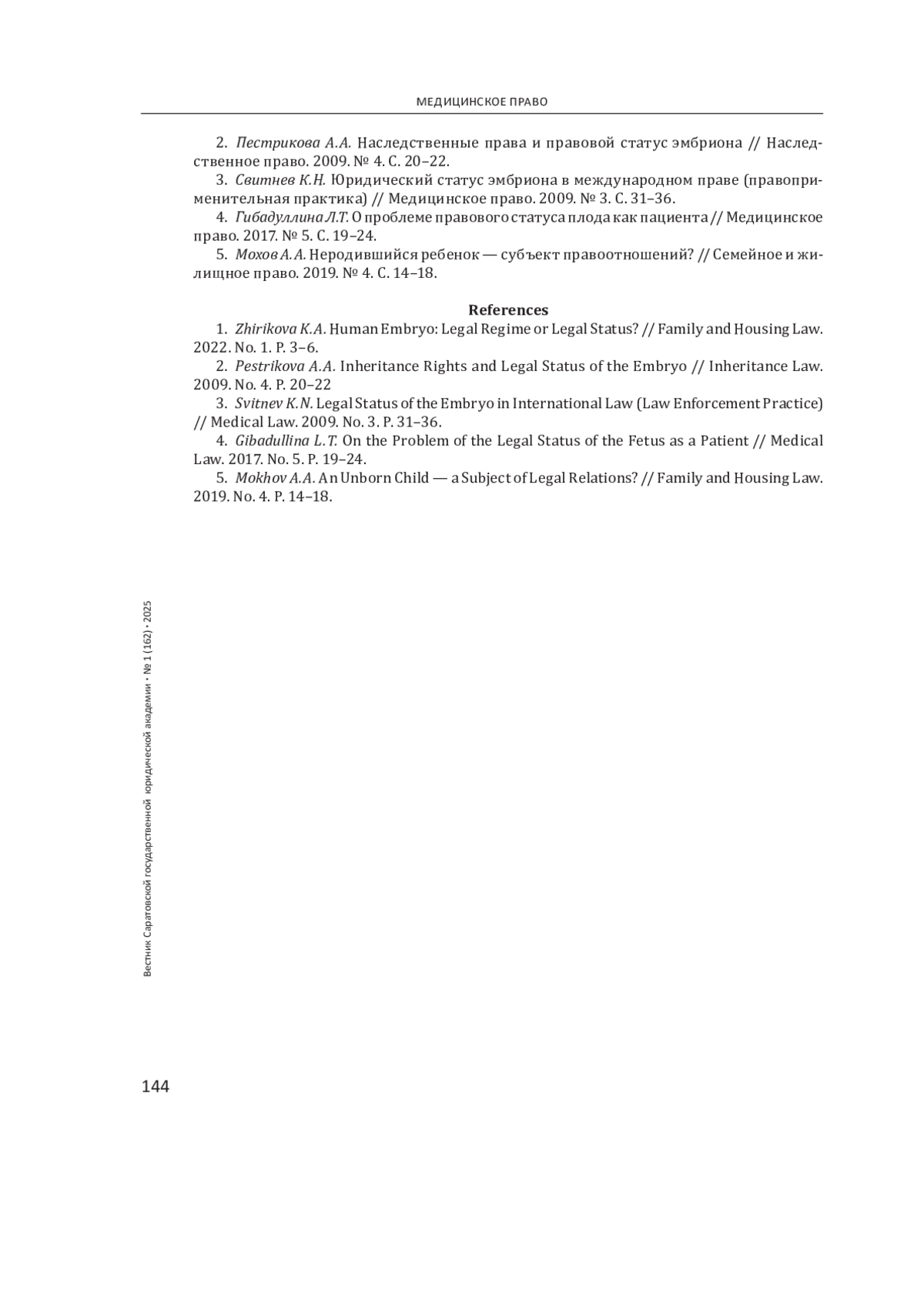 1. Жирикова К. А. Эмбрион человека: правовой режим или правовой статус? // Семейное и жилищное право. 2022. № 1. С. 3-6. EDN: QVEYGV