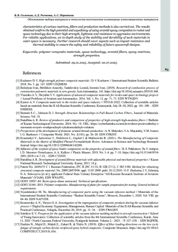 [3] Власенко А. В., Скрябин В. В. Применения перспективных композиционных материалов для проектов ракетно-космической техники // Актуальные проблемы авиации и космонавтики. 2016. Т. 1, № 12. С. 71–73. EDN WTNQDV.
