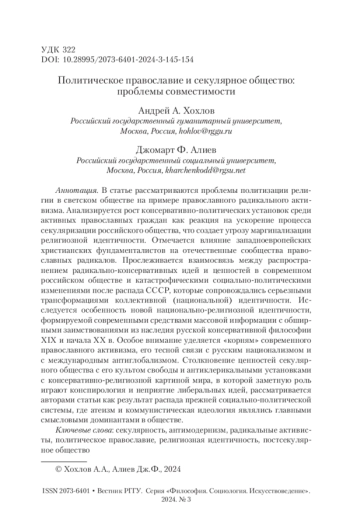 В статье рассматриваются проблемы политизации религии в светском обществе на примере православного радикального активизма. Анализируется рост консервативно-политических установок среди активных православных граждан как реакция на ускорение процесса секуляризации российского общества, что создает угрозу маргинализации религиозной идентичности. Отмечается влияние западноевропейских христианских фундаменталистов на отечественные сообщества православных радикалов. Прослеживается взаимосвязь между распространением радикально-консервативных идей и ценностей в современном российском обществе и катастрофическими социально-политическими изменениями после распада СССР, которые сопровождались серьезными трансформациями коллективной (национальной) идентичности. Исследуется особенность новой национально-религиозной идентичности, формируемой современными средствами массовой информации с обширными заимствованиями из наследия русской консервативной философии XIX и начала XX в. Особое внимание уделяется «корням» современного православного активизма, его тесной связи с русским национализмом и с международным антиглобализмом. Столкновение ценностей секулярного общества с его культом свободы и антиклерикальными установками с консервативно-религиозной картиной мира, в которой заметную роль играют конспирология и неприятие либеральных идей, рассматривается авторами статьи как результат распада прежней социально-политической системы, где атеизм и коммунистическая идеология являлись главными смысловыми доминантами в обществе.