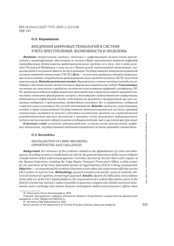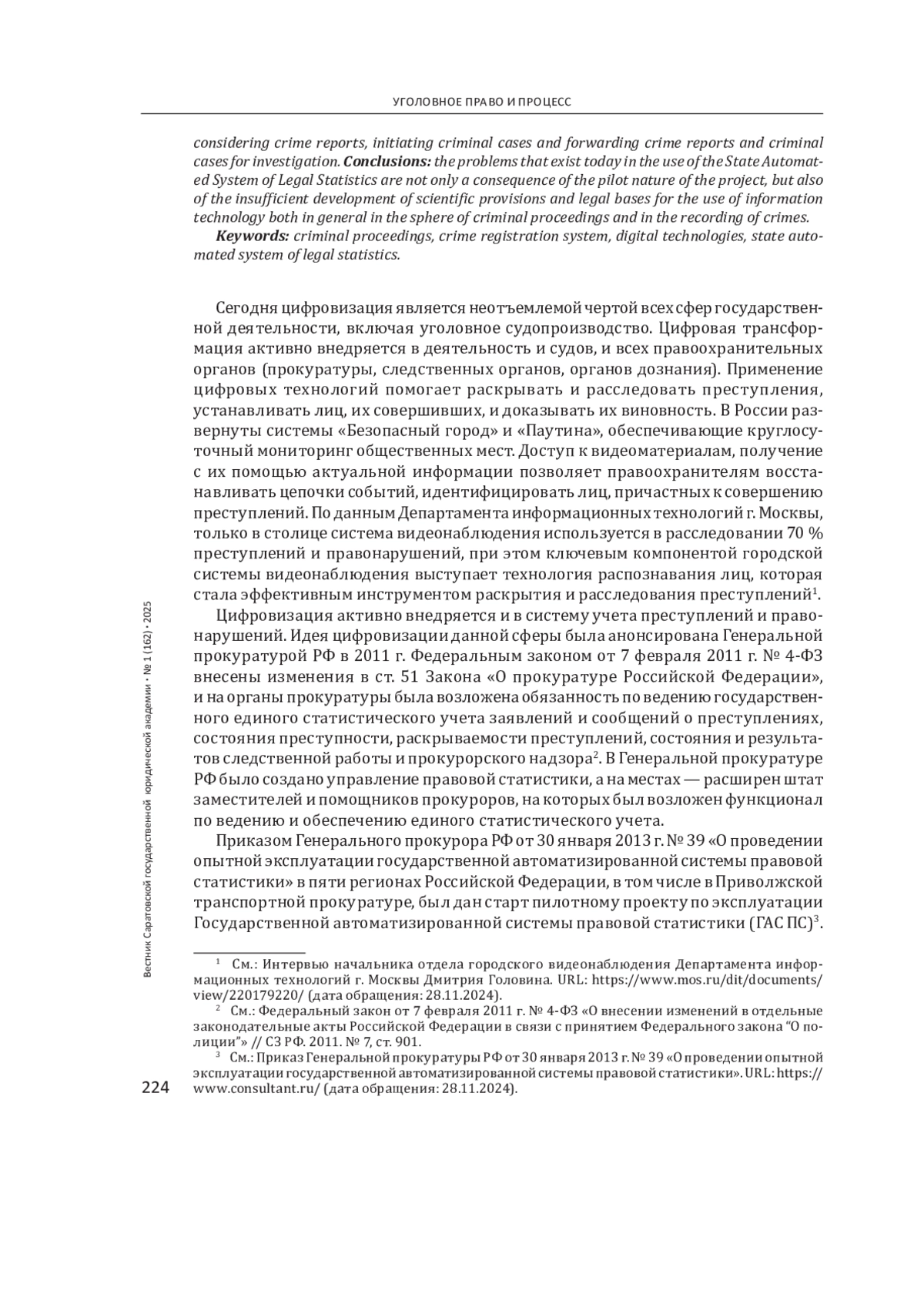 Введение: актуальность проблем, связанных с цифровизацией систем учета преступлений и правонарушений, обусловлена не только общей значимостью вопросов цифровой трансформации деятельности правоохранительных органов, но и тем, что в пяти регионах Российской Федерации, в том числе в Приволжской транспортной прокуратуре, осуществляется пилотный проект по эксплуатации Государственной автоматизированной системы правовой статистики (ГАС ПС). Цель - осмыслить проблемы, которые появились при использовании сотрудниками правоохранительных органов системы ГАС ПС для учета преступлений.