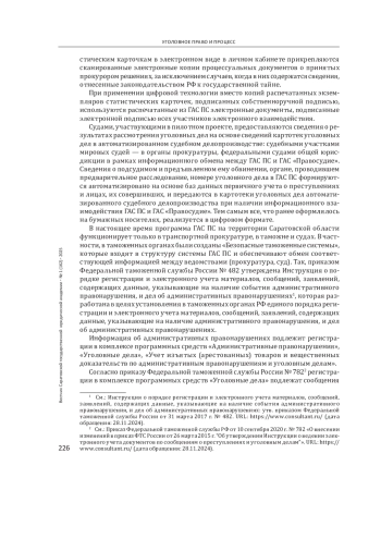 8. Приказ Федеральной таможенной службы России от 10 сентября 2020 г. № 782 “О внесении изменений в приказ ФТС России от 26 марта 2015 г. “Об утверждении Инструкции о ведении электронного учета документов по сообщениям о преступлениях и уголовным делам”. URL: https://www.consultant.ru/ (дата обращения: 28.11.2024).