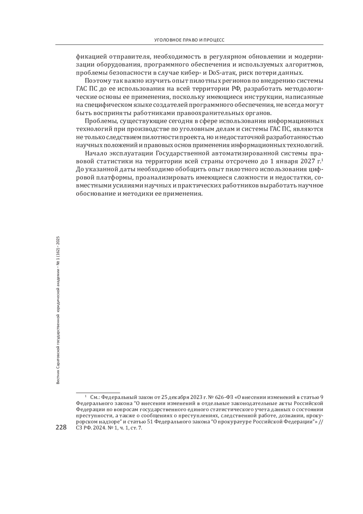 Результаты: несмотря на сложности и проблемы пилотного использования цифровой платформы ГАС ПС, организация единого информационного пространства в области уголовно-правовой статистики позволяет формировать полную и достоверную статистическую информацию, обмениваться информацией между следственными органами и прокуратурой при рассмотрении сообщений о преступлении, возбуждении уголовных дел и направлении сообщений о преступлении и уголовных дел по подследственности.