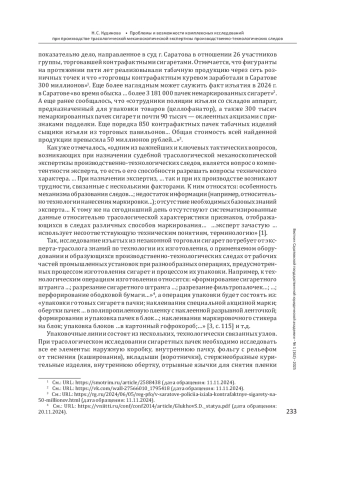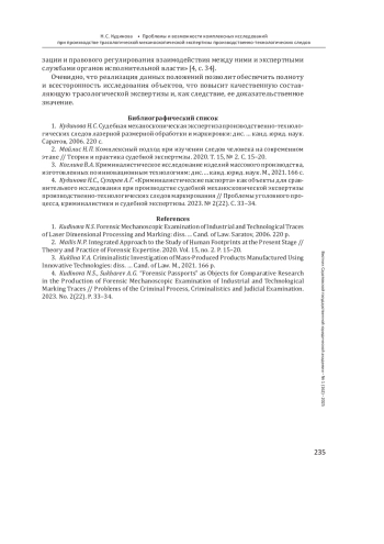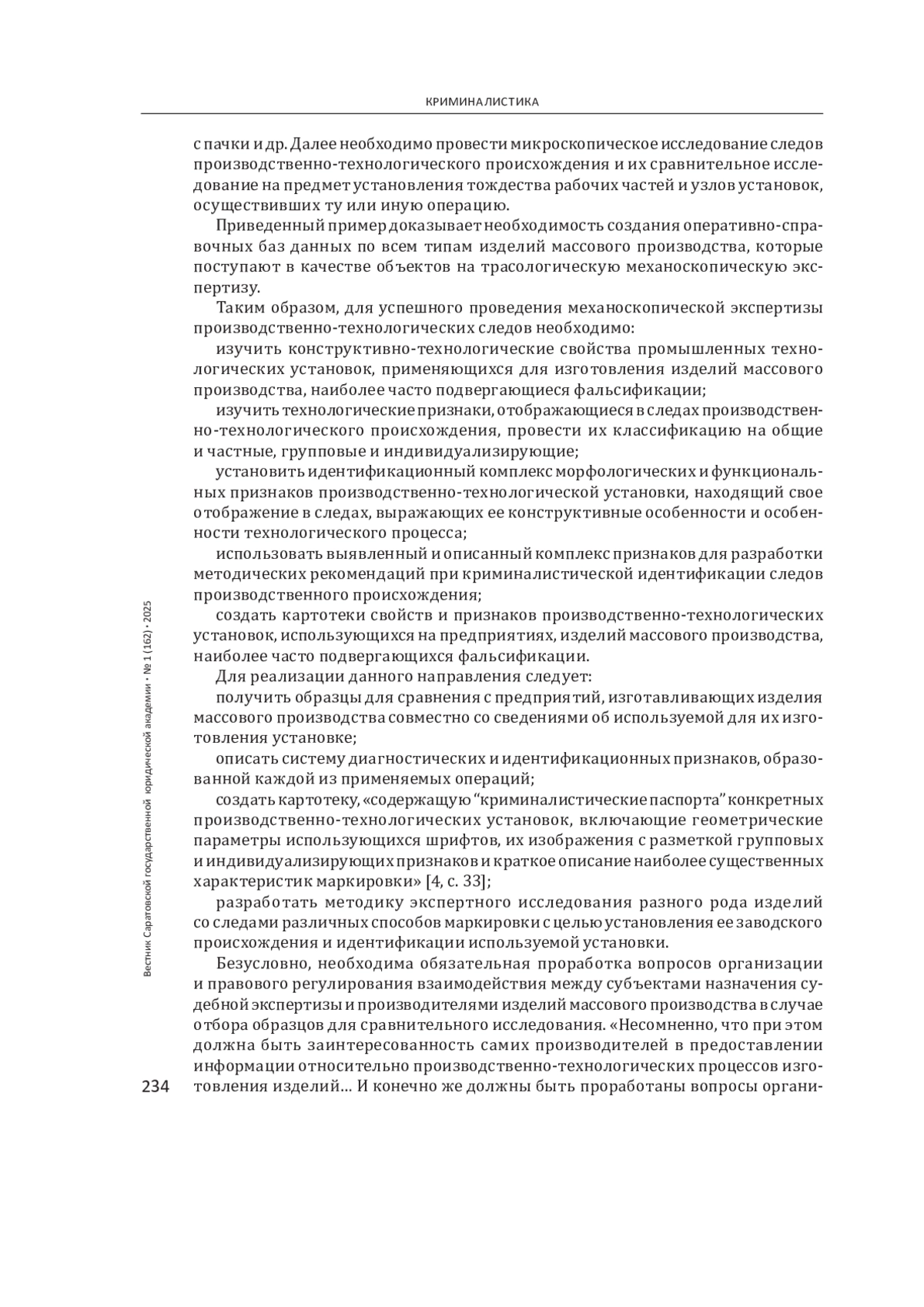 КУДИНОВА Н. С. ПРОБЛЕМЫ И ВОЗМОЖНОСТИ КОМПЛЕКСНЫХ ИССЛЕДОВАНИЙ ПРИ ПРОИЗВОДСТВЕ ТРАСОЛОГИЧЕСКОЙ МЕХАНОСКОПИЧЕСКОЙ ЭКСПЕРТИЗЫ ПРОИЗВОДСТВЕННО-ТЕХНОЛОГИЧЕСКИХ СЛЕДОВ // ВЕСТНИК САРАТОВСКОЙ ГОСУДАРСТВЕННОЙ ЮРИДИЧЕСКОЙ АКАДЕМИИ. 2025. № 1 (162)