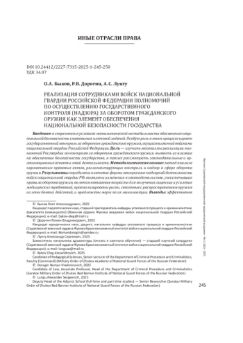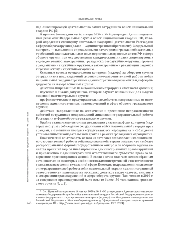 Результаты: определены ключевые формы контрольно-надзорной деятельности войск национальной гвардии РФ, выявлены изменения в законодательстве, ужесточившие правила оборота оружия, включая повышение возраста для получения лицензии и усиление медицинских требований, проанализированы риски, связанные с распространением оружия из зоны боевых действий, и предложены меры по их минимизации.