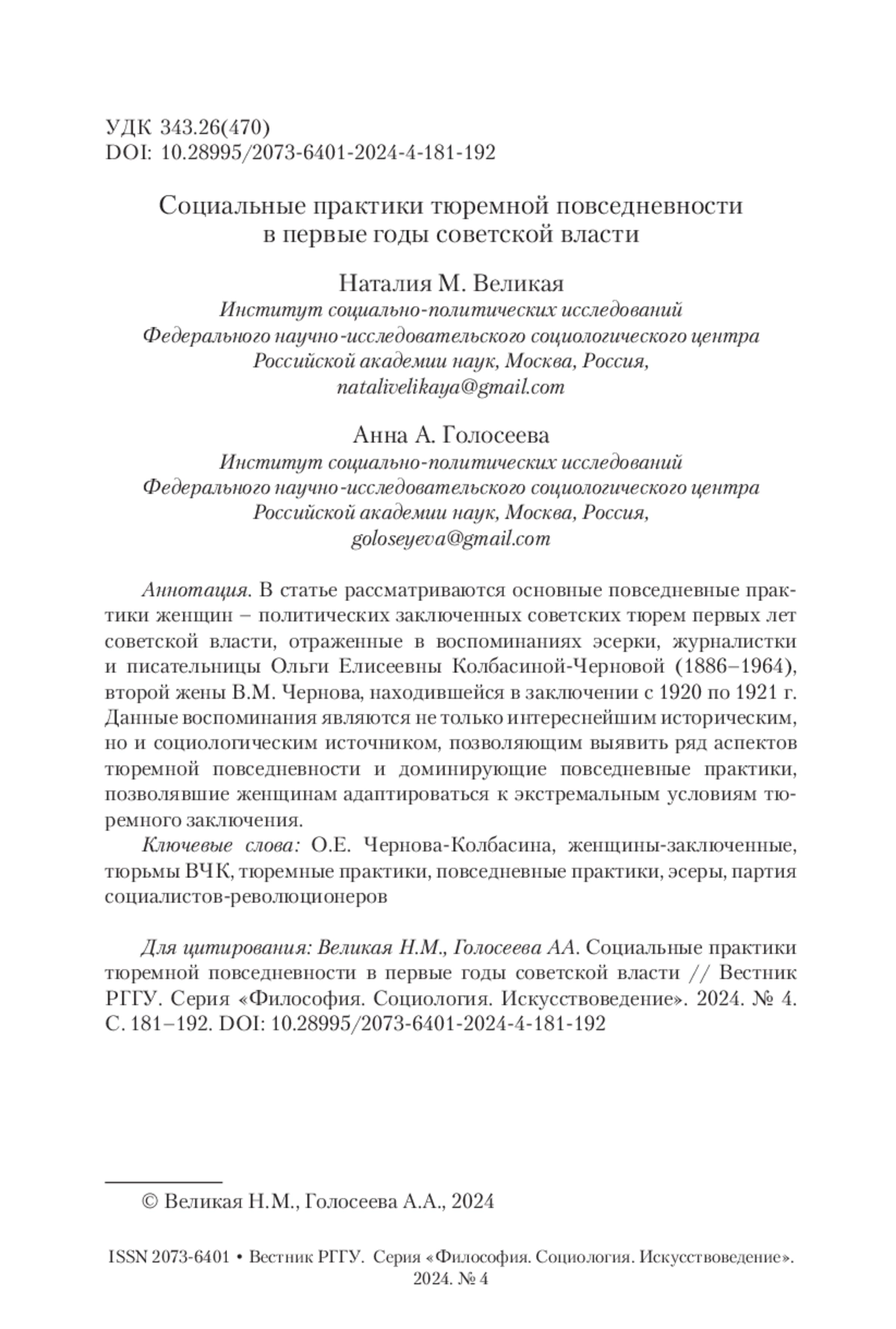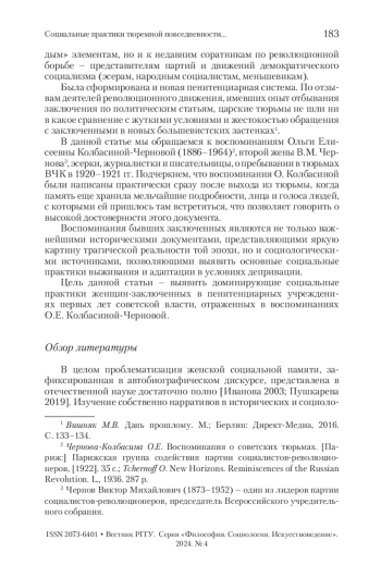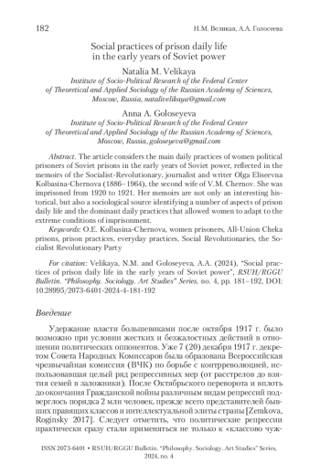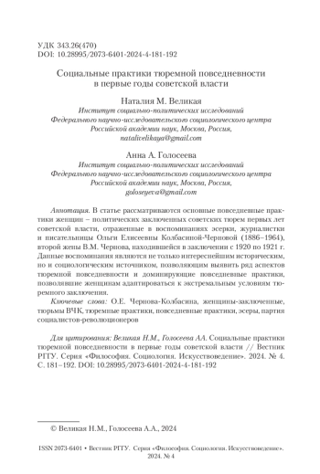 В статье рассматриваются основные повседневные практики женщин – политических заключенных советских тюрем первых лет советской власти, отраженные в воспоминаниях эсерки, журналистки и писательницы Ольги Елисеевны Колбасиной-Черновой (1886–1964), второй жены В. М. Чернова, находившейся в заключении с 1920 по 1921 г. Данные воспоминания являются не только интереснейшим историческим, но и социологическим источником, позволяющим выявить ряд аспектов тюремной повседневности и доминирующие повседневные практики, позволявшие женщинам адаптироваться к экстремальным условиям тюремного заключения.