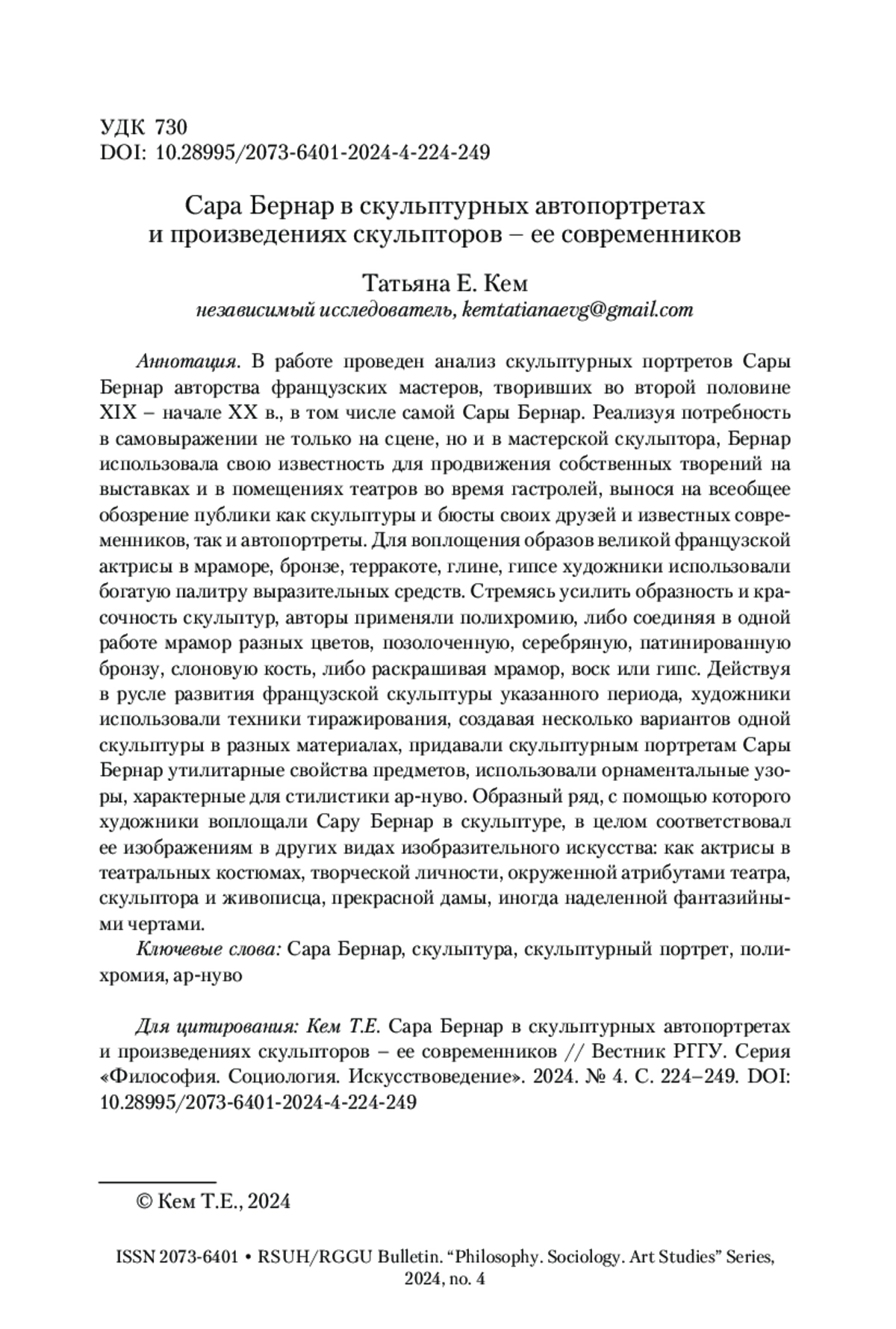 В работе проведен анализ скульптурных портретов Сары Бернар авторства французских мастеров, творивших во второй половине XIX – начале ХХ в., в том числе самой Сары Бернар. Реализуя потребность в самовыражении не только на сцене, но и в мастерской скульптора, Бернар использовала свою известность для продвижения собственных творений на выставках и в помещениях театров во время гастролей, вынося на всеобщее обозрение публики как скульптуры и бюсты своих друзей и известных современников, так и автопортреты. Для воплощения образов великой французской актрисы в мраморе, бронзе, терракоте, глине, гипсе художники использовали богатую палитру выразительных средств. Стремясь усилить образность и красочность скульптур, авторы применяли полихромию, либо соединяя в одной работе мрамор разных цветов, позолоченную, серебряную, патинированную бронзу, слоновую кость, либо раскрашивая мрамор, воск или гипс. Действуя в русле развития французской скульптуры указанного периода, художники использовали техники тиражирования, создавая несколько вариантов одной скульптуры в разных материалах, придавали скульптурным портретам Сары Бернар утилитарные свойства предметов, использовали орнаментальные узоры, характерные для стилистики ар-нуво. Образный ряд, с помощью которого художники воплощали Сару Бернар в скульптуре, в целом соответствовал ее изображениям в других видах изобразительного искусства: как актрисы в театральных костюмах, творческой личности, окруженной атрибутами театра, скульптора и живописца, прекрасной дамы, иногда наделенной фантазийными чертами.