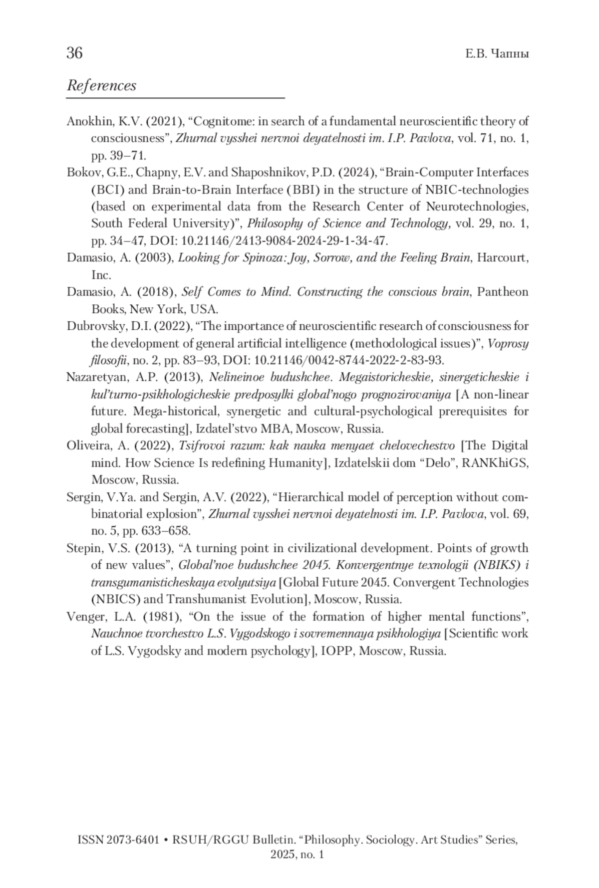 2. Боков и др. 2024 - Боков Г.Е., Чапны Е.В., Шапошников П.Д. Интерфейсы «мозг- компьютер» и «мозг-мозг» в структуре конвергирующих технологий (на основе экспериментальных данных НИТЦ нейротехнологий ЮФУ) // Философия науки и техники. 2024. Т. 29. № 1. С. 34-47. https://doi.org/10.21146/2413-9084-2024-29-1-34-47.