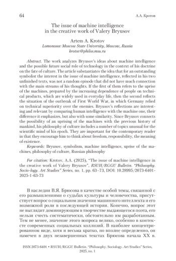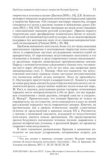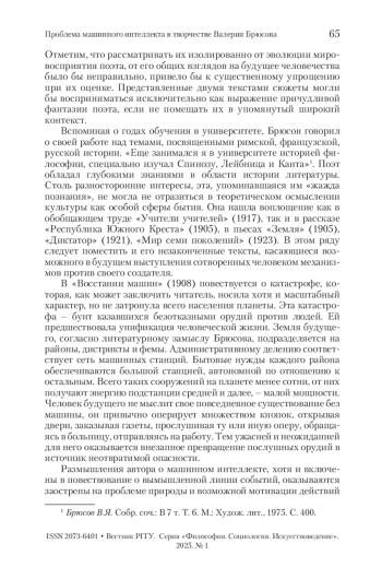 В работе анализируются представления Брюсова о машинном интеллекте и возможной будущей социальной роли техники в контексте его учения о судьбе культуры. В статье обосновывается мысль о том, что для выдающегося символиста интерес к проблеме машинного интеллекта, нашедший отражение в двух его незавершенных текстах, не был случайным эпизодом, не имевшим особой связи с главными линиями его размышлений. Если в первом из них говорится о восстании машин, подготовленном возрастающей зависимостью людей от продуктов технического производства, масштабно применяемых в повседневной жизни, то во втором находит отражение ситуация начавшейся Первой мировой войны, в которой Германией сделана ставка на техническое превосходство над противниками. Размышления Брюсова интересны и актуальны сопоставлением человеческого интеллекта с машинным, подчеркиваемым им различием, но и некоторым родством. Поскольку возможность восстания машин Брюсов связывает с предшествующей историей человечества, его философия культуры включает целый ряд непривычных, необычных для научного сознания его эпохи тем. Они важны для современного читателя тем, что побуждают его к размышлениям о свободе, ответственности, смысле жизни.