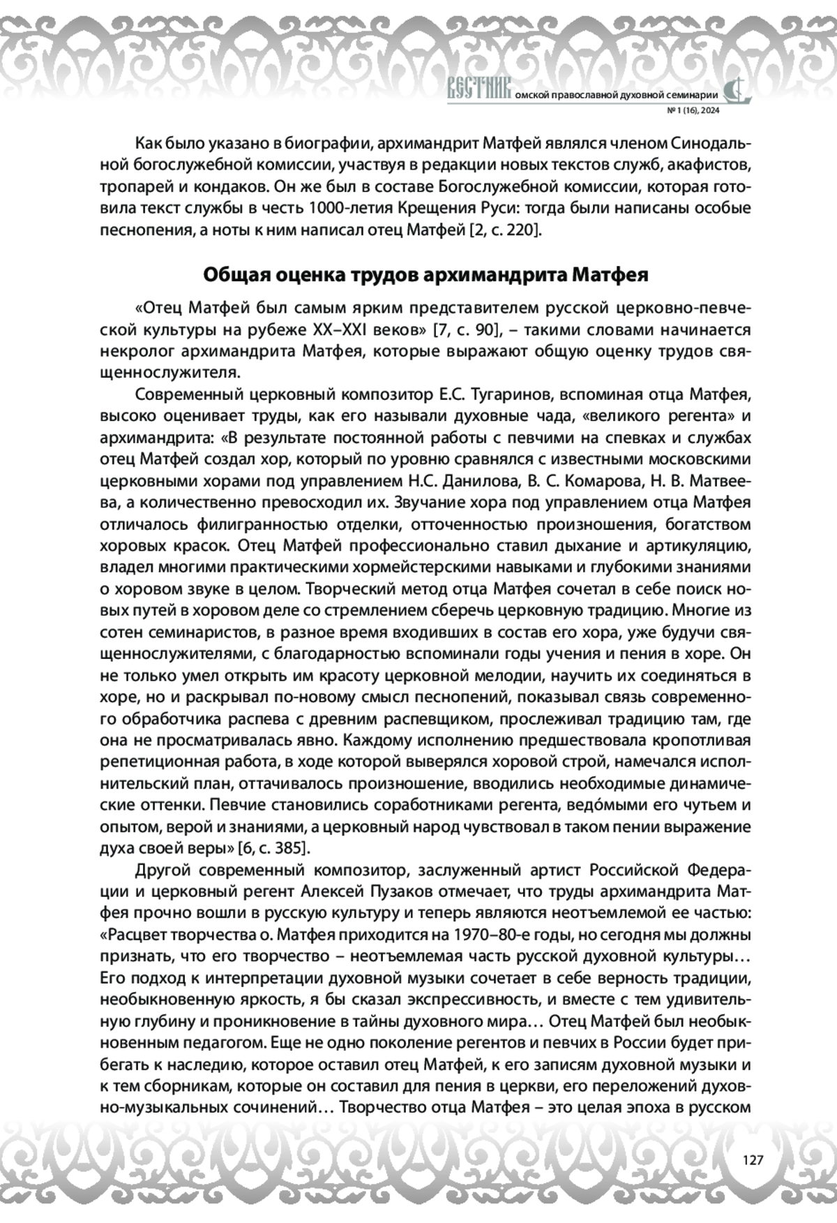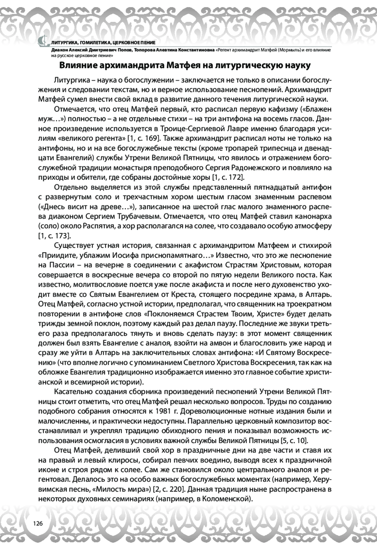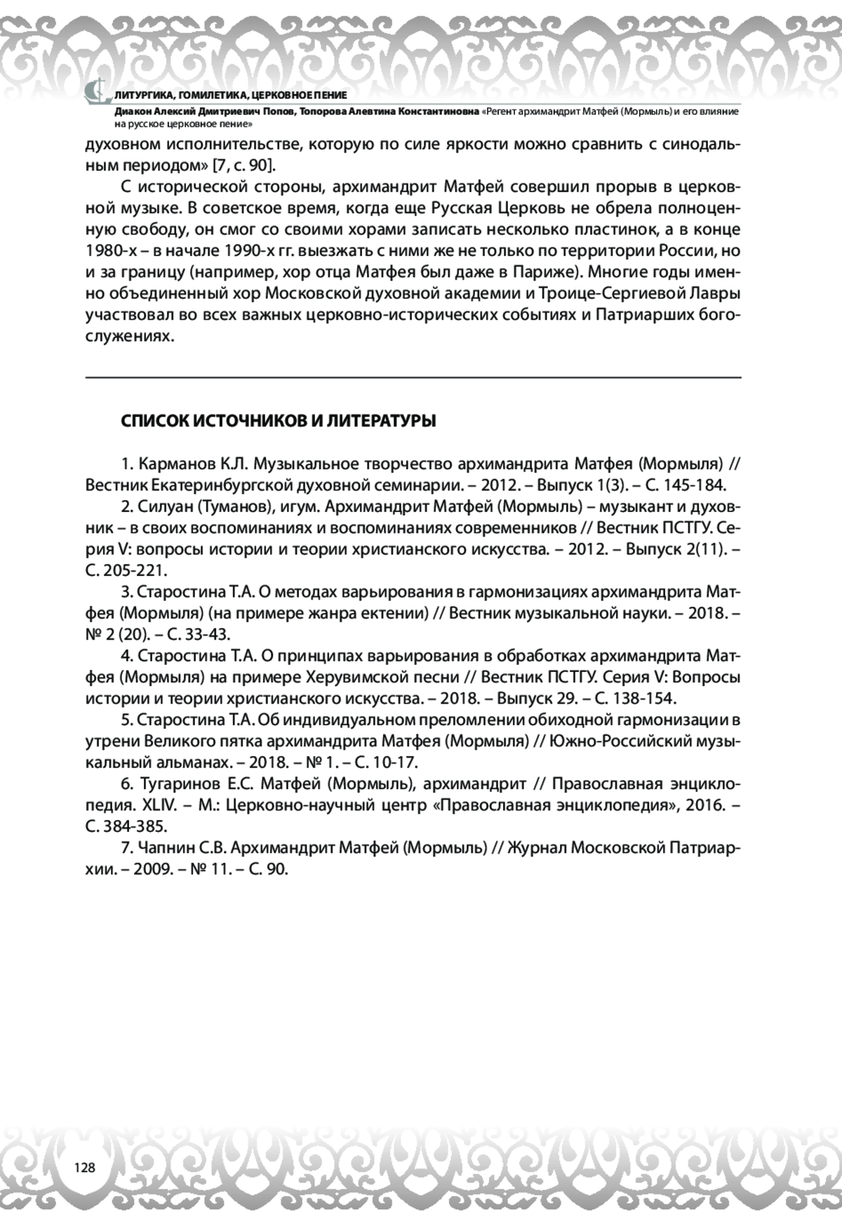 Попов А.Д., диак., Топорова А.К. Регент архимандрит Матфей (Мормыль) и его влияние на русское церковное пение // Вестник Омской православной духовной семинарии. - 2024. - №1 (16). - С.123-128.