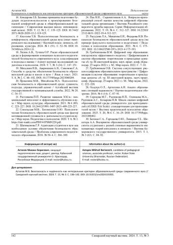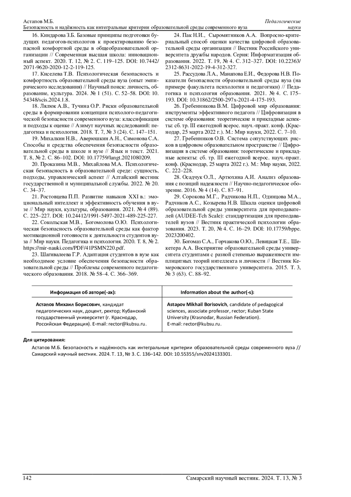 25. Рассудова Л.А., Манапова Е.И., Федорова Н.В. Показатели безопасности образовательной среды вуза (на примере факультета психологии и педагогики) // Педагогика и психология образования. 2021. № 4. С. 175-193. DOI: 10.31862/2500-297x-2021-4-175-193 EDN: PHESBK