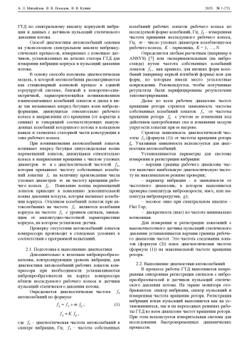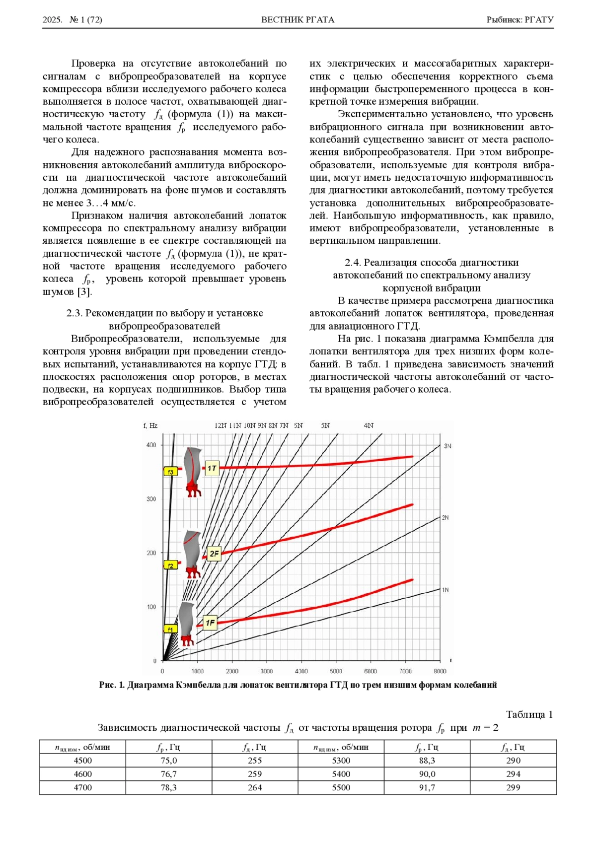 Подавляющее большинство разрушений рабочих лопаток компрессоров ГТД имеет усталостный характер и связано с переменными напряжениями, возникающими в них при колебаниях. Особый случай представляют автоколебания – нерезонансные самовозбуждающиеся (без внешних периодических воздействий) колебания с незатухающей амплитудой, поддерживаемые переменными аэродинамическими силами, возникающими при колебательном движении лопаток из-за упругих обратных связей. Наиболее часто в рабочих лопатках (РЛ) компрессора ГТД возникают низкочастотные автоколебания (АК), происходящие по первым трем низшим формам собственных колебаний (первой изгибной, первой крутильной и второй изгибной). Автоколебания характеризуются быстрым ростом амплитуды вибронапряжений в лопатках компрессора ГТД до опасных значений, которые могут привести к их разрушению [1, 2]. Поэтому повышение информативности динамических сигналов, используемых при диагностике автоколебаний, особенно в режиме реального времени, является важной задачей